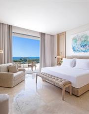 This expansive resort boasts 384 elegantly designed rooms, suites, and villas, some with private pools or direct beach access. Dining is a culinary journey, offering rich gastronomy and cuisines to healthy juices, or exclusive wines. Whether enjoying a poolside snack or a refined à la carte dinner, the diverse options are sure to satisfy every palate. Guests can unwind at the Elixir Spa, explore six stunning pools, or enjoy activities like tennis, yoga, and watersports. Families will love Grecoland Kids Club, while couples can indulge in private yacht charters and romantic beach dinners.