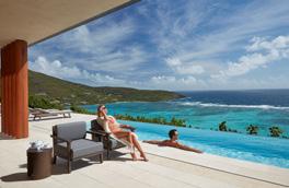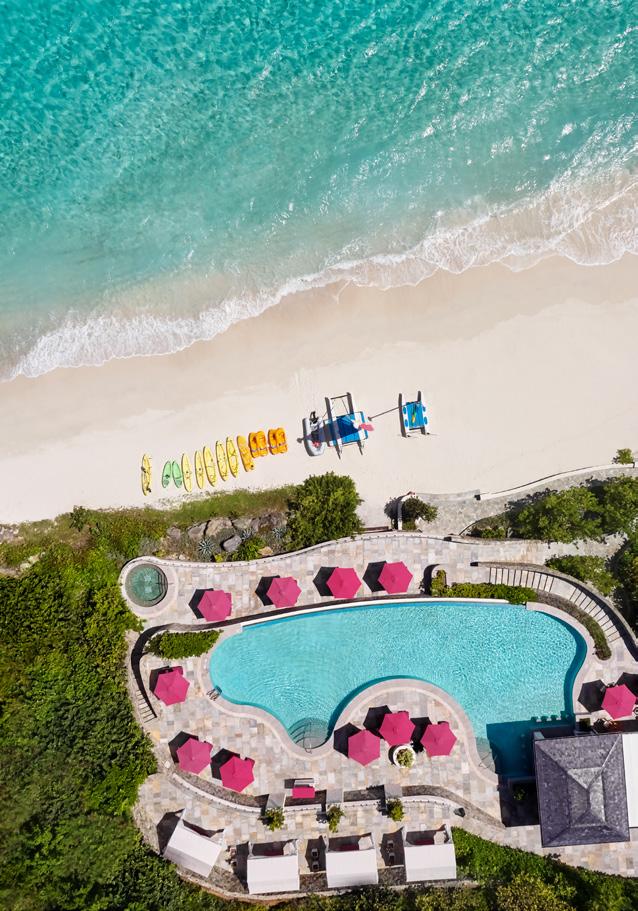 Long Bay Beach Resort, located on Tortola’s West End in the British Virgin Islands, offers a unique blend of luxury and island history. It reopened in December 2020 after a careful twoyear redesign, showcasing Caribbean elegance. The resort covers a mile-long stretch of white sandy beach with turquoise waters, surrounded by tall palm trees and iconic island peaks. Using natural materials like stone, wood and wicker, the design creates airy spaces that reflect the peaceful surroundings. The resort features 37 rooms, including 10 suites, each with its own private terrace or pergola offering breathtaking sea views. Beachside Villas and Beach Houses provide private sandy stretches and personal plunge pools ensuring intimacy and exclusivity. Dining highlights Caribbean flavours with fresh, organic ingredients from local farms, fisheries and the resort’s very own garden.