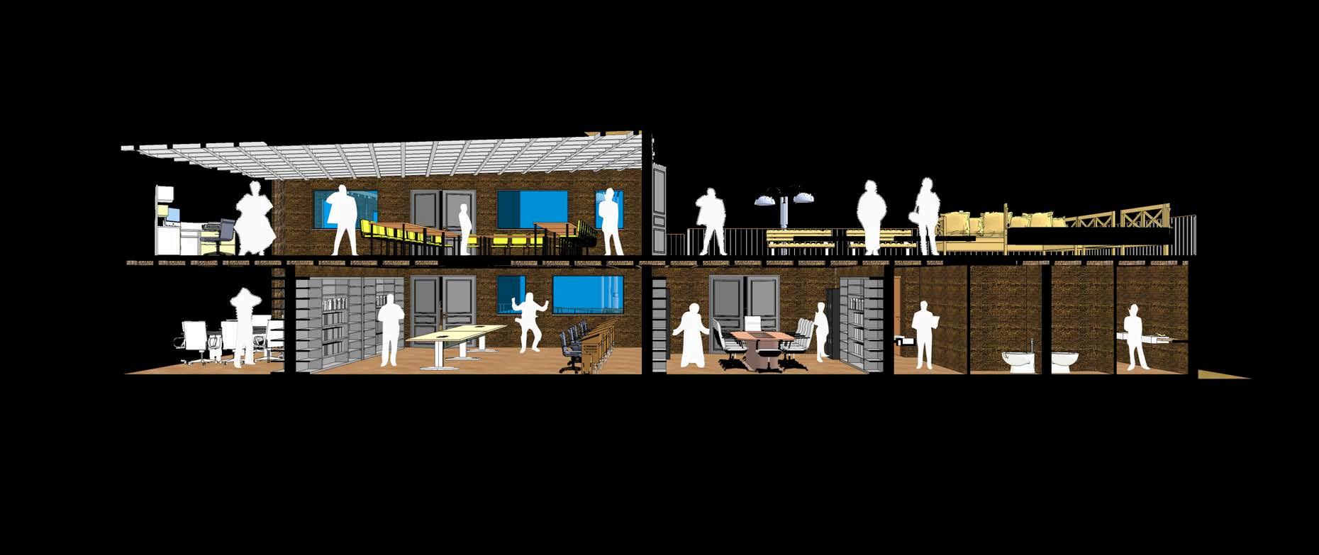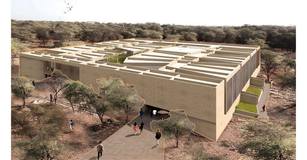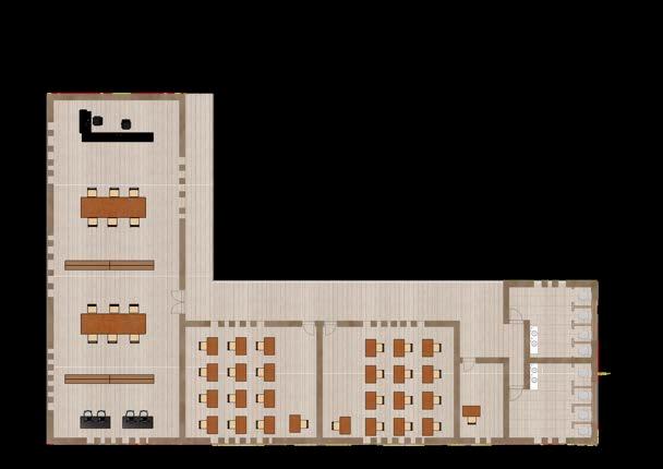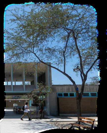 Unadelasgrandesvirtudesdeldiseño deestecentrodeprendizajeessupatio centralamplio,quenosoloorganizalos espacios que lo rodean, sino que también se convierte en una herramienta clave para mejorar el comportamiento ambiental del edificio. Supresenciapermitequelaluznatural ingrese de manera uniforme a lo largo deldía,alcanzandoinclusolosespacios más interiores. Esto no solo reduce significativamenteelusodeiluminación artificial, sino que también genera una atmósfera más cálida, más humana y conectadaconelritmodelsol.