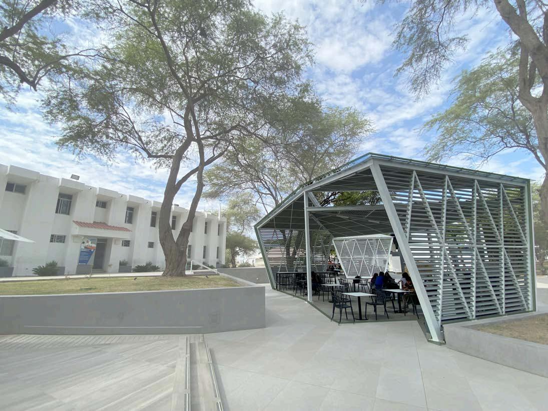 Junto a estas suculentas, se han incorporado arbustos nativos como el lechuguilla y el izote, que añaden una dimensiónverticalycontrastesvisuales interesantes, creando un equilibrio dinámicoentrelasáreassombreadasy lasexpuestasalsolalolargodeldía. Estos elementos vegetales no solo embellecen el espacio, sino que también refuerzan la estructura visual deldiseñoescalonado.Enlaszonasde transiciónentrelosniveles,seutilizaron pastos nativos y hierbas resistentes, como el zacate buffel, que forman un manto verde suave y resistente, cohesionandolasterrazasysuavizando las líneas angulares del adobe con un toque orgánico. Además, se incluyeron pequeños árboles de sombra, como el mezquite, plantados de manera estratégicaenlasáreascomunespara proporcionar refugio natural, reducir la temperatura ambiente y mejorar el confort térmico, especialmente durante lashorasdemayorcalor.Estaselección de vegetación responde de manera precisa a las condiciones climáticas y topográficas del terreno, asegurando que cada especie prospere sin exigir intervencionesintensivas.