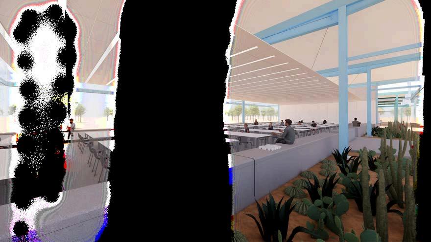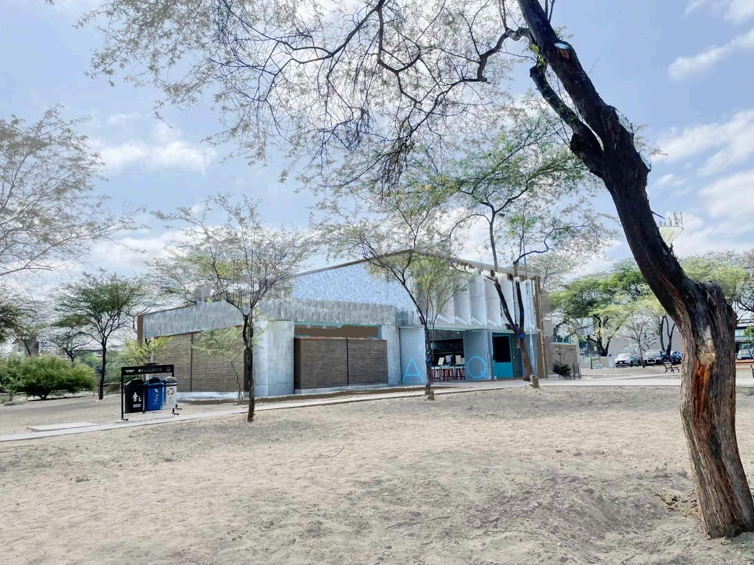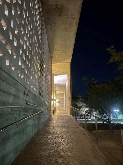 Resuelto a través de un sistema de ventilación natural cruzada eficiente y adaptado al clima cálido-seco. El flujo de aire se genera e ingresa desde las aberturas ubicadas en las fachadas laterales, recorriendo transversalmente todo el espacio nterior. Este aire también ingresa por vanos bajos y medios y se desplaza horizontalmente por el volumen principal. Conforme se calienta en contacto con el cuerpo humano o el propio entorno arquitectónico, el aire asciende y escapa por lucernarios superiores o franjasdeventilaciónaltas,ayudadopor lasdiferenciasdepresiónytemperatura entre exterior e interior. Este sistema pasivo no solo permite mantener un ambiente fresco, sino que además reduce la necesidad de ventilación mecánica, haciendo el edificio más sostenible, económico y resiliente. La circulación del aire fue pensada como uncomponentefundamentaldelconfort térmico,permitiendoquesepuedausar elespaciodeformaprolongadasinque segenerencondicionesdesofoco.