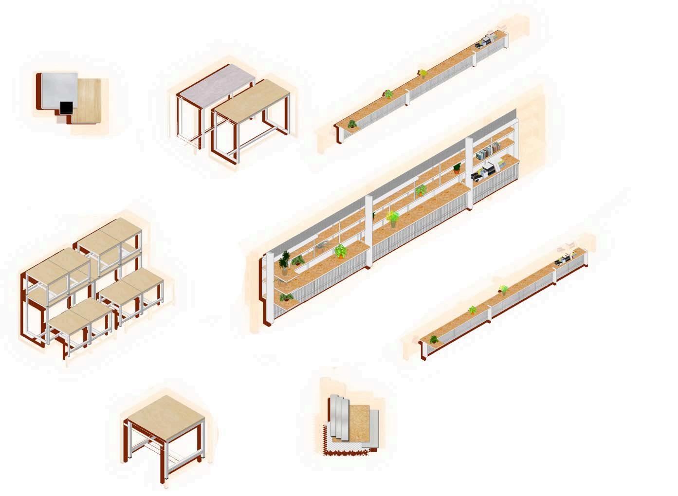 El mobiliario principal está compuesto por once banquitos de 50×50×45cm y seis mesas de 110×50×75cm. Tanto los banquitos como las mesas están fabricados con tableros de madera de pino, lo que les otorga una apariencia cálida y natural. Las estructuras de ambos tipos de mobiliario tienen las patastubularesrectangularesmetálicas de color blanco, que proporcionan estabilidad y un diseño limpio y contemporáneo. Además, cada banquito cuenta con una base de plástico negro en cada pata, lo cual protege las superficies y mejora la durabilidaddelmobiliario.
