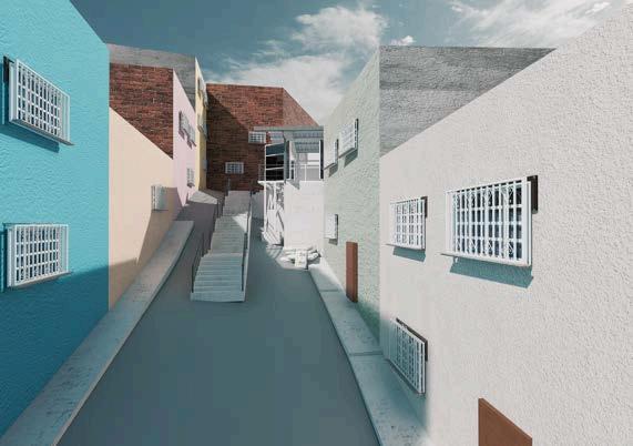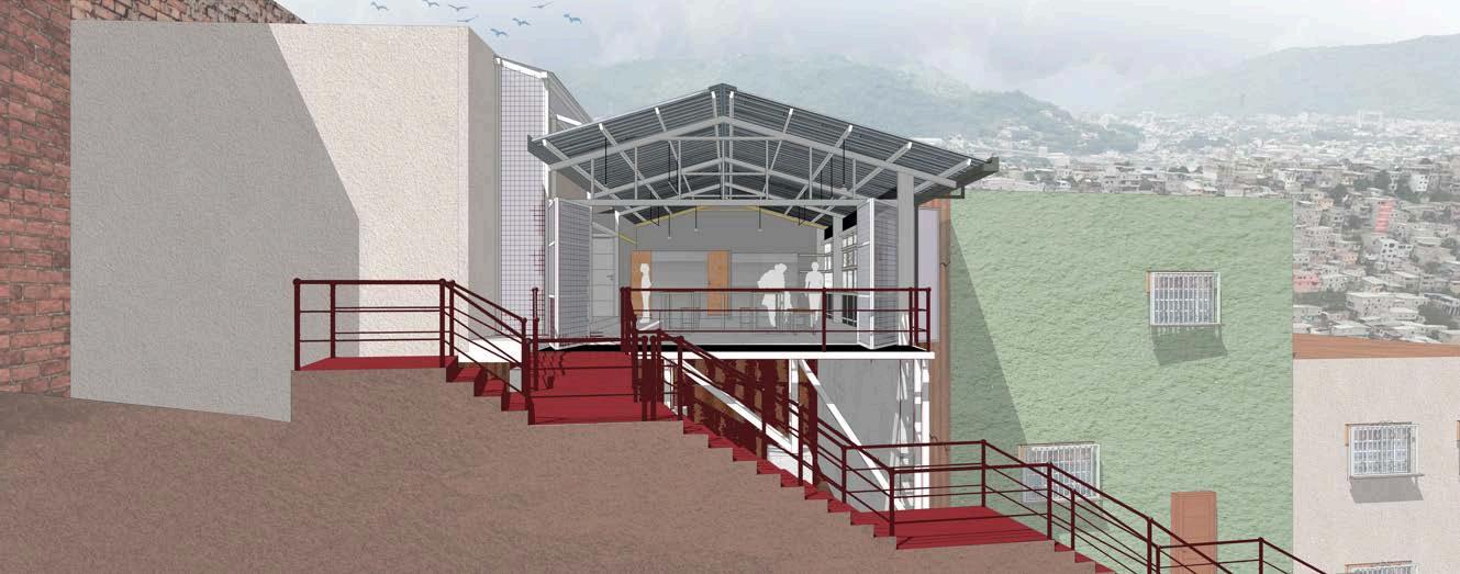 Esta disposición también permite que las personas lleguen desde distintos puntosdelbarrioyconverjanhaciaun mismonivelelevado.Estaconvergencia no solo es funcional sino también social:convierteelactodesubirenuna experienciacompartida,reforzandolos encuentros y las relaciones vecinales desde el momento mismo del acceso. Además,seinsertadeformacoherente en el sistema general del barrio: las escalerasdelproyectoseconviertenen una extensión del recorrido urbano preexistente,articulandoeledificiocon el entorno inmediato. El proyecto no impone un nuevo orden, sino que se adapta y fortalece las dinámicas existentes, validando las formas de habitar y desplazarse propias de la comunidad. El flujo vertical no solo resuelve una necesidad topográfica, también constituye una estrategia de integración urbana, empoderamiento simbólicoydiseñoparticipativo.Esun ejemplo de cómo una solución arquitectónica puede ser también una herramienta social, de conexión, identidadytransformacióncolectiva.
