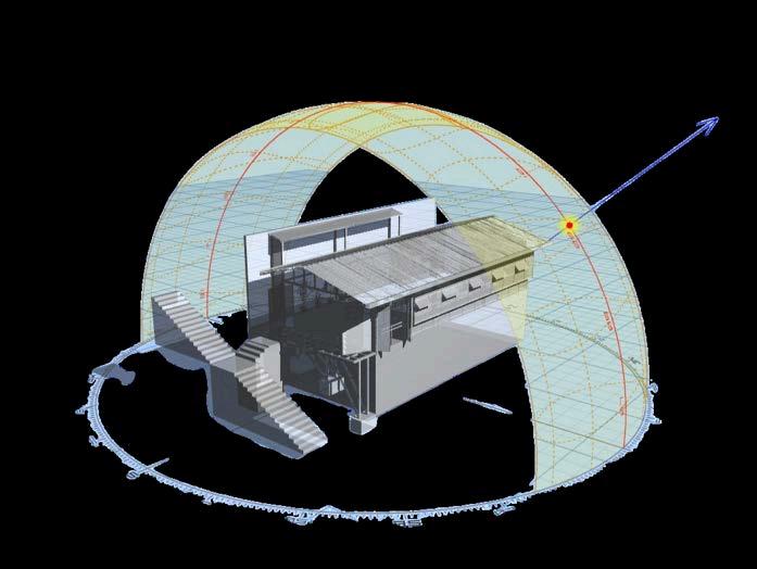El edificio está cuidadosamente resuelto para maximizar la iluminación natural sin comprometer el confort térmico.Laorientacióndelvolumenyla pendiente de la cubierta están diseñadas para recibir la luz solar del estedurantelasprimerashorasdeldía, aportandoclaridadtenueyhomogénea sin generar acumulación de calor excesivo. Los rayos solares entran tangencialmentedesdeladerechayla izquierda durante la mañana, mientras quealmediodíaeldiseñodelaleroyla pendientedeltechoimpidenqueelsol incida directamente sobre el espacio interior,especialmenteenlospuntosde mayor uso. Durante la tarde el ángulo solar desciende, pero gracias a las aberturas laterales, la luz se filtra y difunde, evitando deslumbramientos o zonasrecalentadas.Estaintegraciónde luz y forma convierte al espacio comunalenunambientedinámico. aprovechamiento inteligente del sol transforma así la casa comunal en un referente de arquitectura bioclimática sensibleyeficiente.