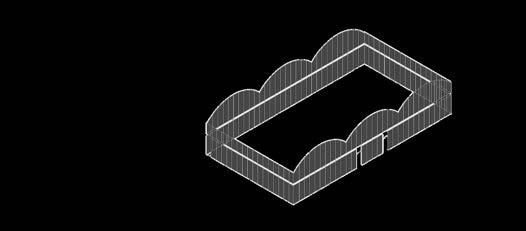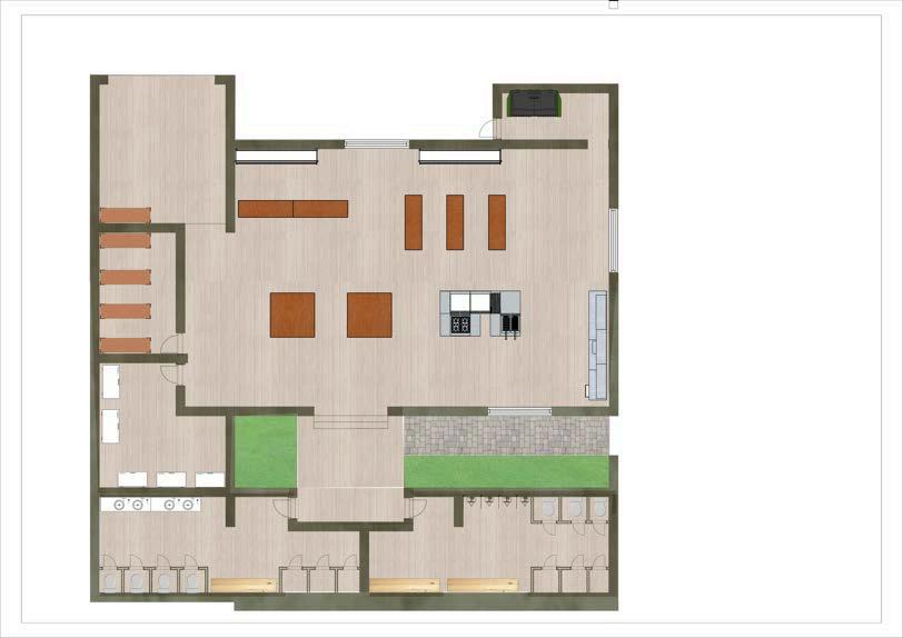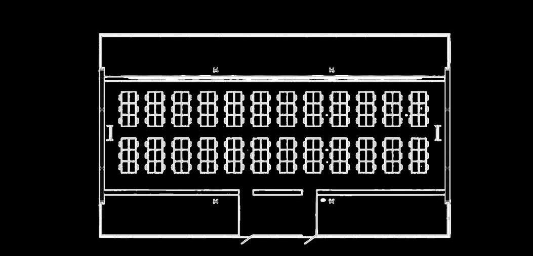 Alolargodelperímetrointerior,bancas fijas y mesas móviles permiten reorganizar el mobiliario según las necesidades. En la parte posterior del salón, hacia el fondo de la planta, se encuentranlosespaciosdeapoyo:una cocina,dosbañosyunabodega.Estos se distribuyen de forma alineada, permitiendo una circulación secundaria de servicio que no interfiere con las actividades del área central. Además, las aberturas laterales, no solo garantizanunaadecuadailuminacióny ventilación, sino que también permiten conexiones visuales y de movimiento entreelinterioryelexteriorinmediato, ampliando la percepción espacial del lugar. El esquema de circulación favorece tanto el uso libre del espacio como la integración comunitaria, manteniendo una relación fluida entre losdistintosnivelesyzonasfuncionales