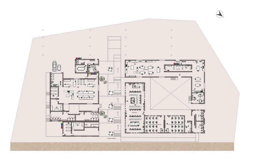 Gracias al uso de la topografía, el proyecto construye una jerarquía espacial implícita: el acceso desde el nivel más bajo, la progresiva elevación hacia zonas de mayor privacidad o importancia institucional (como la dirección),ylacentralidaddelazonade procesamiento. Esta jerarquía no está impuesta mediante muros o cerramientos,sinoatravésdeldesnivel y del recorrido vertical, lo que permite unalecturanaturalyfluidadelespacio sinnecesidaddeseñaléticaexplícita.