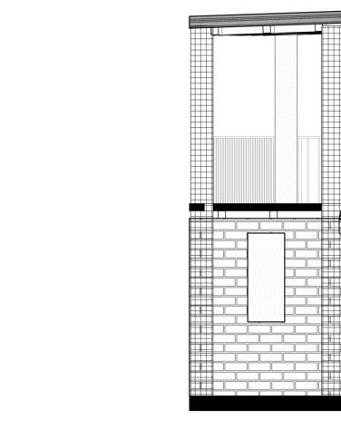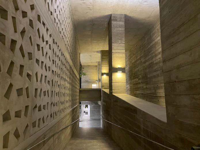 El techo a dos aguas, por su parte, favorece la disipación de sonidos y permiteunaventilaciónnaturaleficiente, algoquesueleserignoradoenmuchas construcciones nuevas donde la forma responde más a lo visual que a lo funcional. Aquí, en cambio, la forma estáalserviciodel Desdeelpuntode vista compositivo, la fachada visible en esta sección presenta un ritmo bien balanceadoentrellenosyvacíos,masas ytransparencias,opacidadesytexturas. La presencia de vanos estrechos, puertasampliasdeaccesoyelementos livianoscomocelosíasobarandillasde madera introduce una cadencia visual que evita la monotonía y permite una lectura armónica del edificio.bienestar interior,entodoslossentidos.Esteritmo no responde únicamente a una intención estética; se basa en una lógica constructiva y climática que regula el ingreso de luz solar, protege del viento y permite la ventilación cruzada,sinnecesidaddemecanismos artificiales. Este tipo de decisiones revela una coherencia interna entre la forma, el material y la función, un equilibrio que suele perderse en proyectosquepriorizanlaimagensobre elsentido.