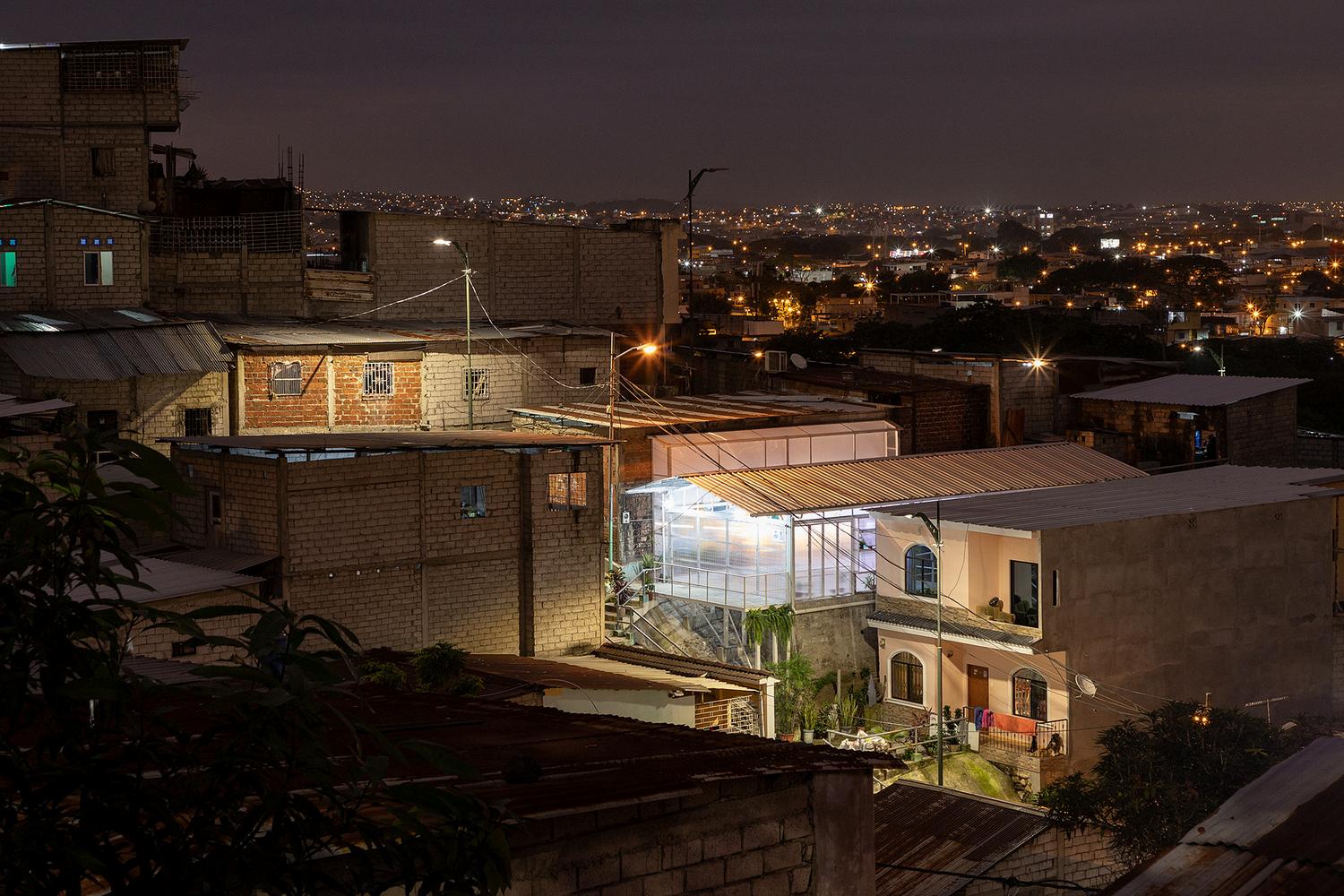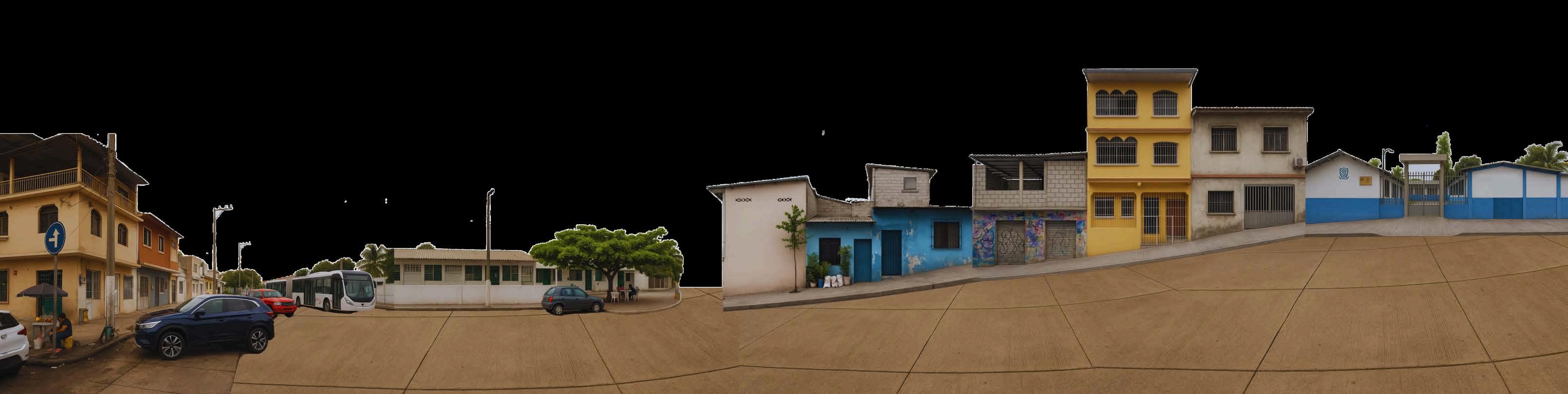 Guayaquil, la ciudad más grande de Ecuador, se extiende a lo largo del río Guayas, combinando áreas urbanas consolidadas con zonas de expansión periférica. A medida que se aleja del centro, se encuentran sectores como Mapasingue,unazonadeladeradonde predominan los asentamientos autoconstruidos. Aquí, las viviendas informales, los caminos de tierra y la vegetación seca configuran el paisaje, mientras que las comunidades han desarrollado formas de organización social basadas en la solidaridad y la interaccióndirectaentrelosvecinos. En este contexto se localiza la Casa ComunalElFaro:enunazonaelevada de Mapasingue, dentro de la provincia del Guayas. El entorno carece de servicios públicos adecuados y presenta una infraestructura urbana limitada, lo que ha condicionado las dinámicas del barrio. Sin embargo, su ubicaciónestratégicalaconvierteenun punto clave para el desarrollo de actividades comunitarias, sirviendo comounazonarepresentativaparalos residentes.