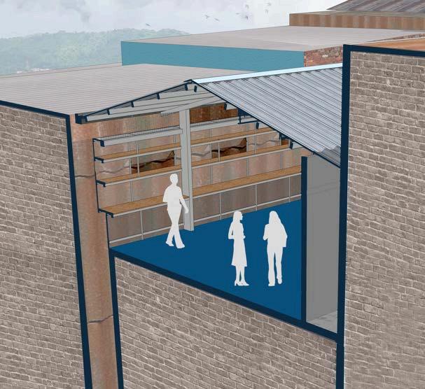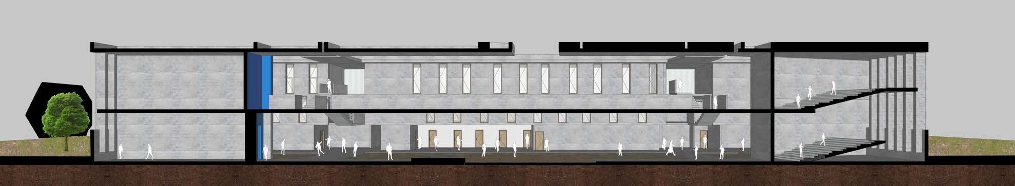 punto: es parte del aprendizaje. Cada cambio de nivel, cada transición entre una función y otra, puede ser interpretadocomouncambiodeestado: de lo público a lo privado, de lo comercialaloformativo,deloexternoa lo institucional. En ese sentido, las escaleras no solo trasladan, sino que comunican. Permiten que el cuerpo se relacione con el espacio, que el aprendizajeocurranosoloenlasaulas, sino también en el movimiento, en la observación, en el descanso entre un tramoyotro. Estasecciónmuestraconclaridadcómo la arquitectura puede aprovechar las condiciones naturales del terreno para generarunaespacialidadrica,compleja yalavezlegible.Aquí,elespacionose imponesobrelageografía:sedejaguiar porella.Lasescalerasyplataformasno son añadidos forzados, sino extensionesdelpropiosuelo,diseñadas con sensibilidad, con una lógica que responde tanto al paisaje como al uso humano.