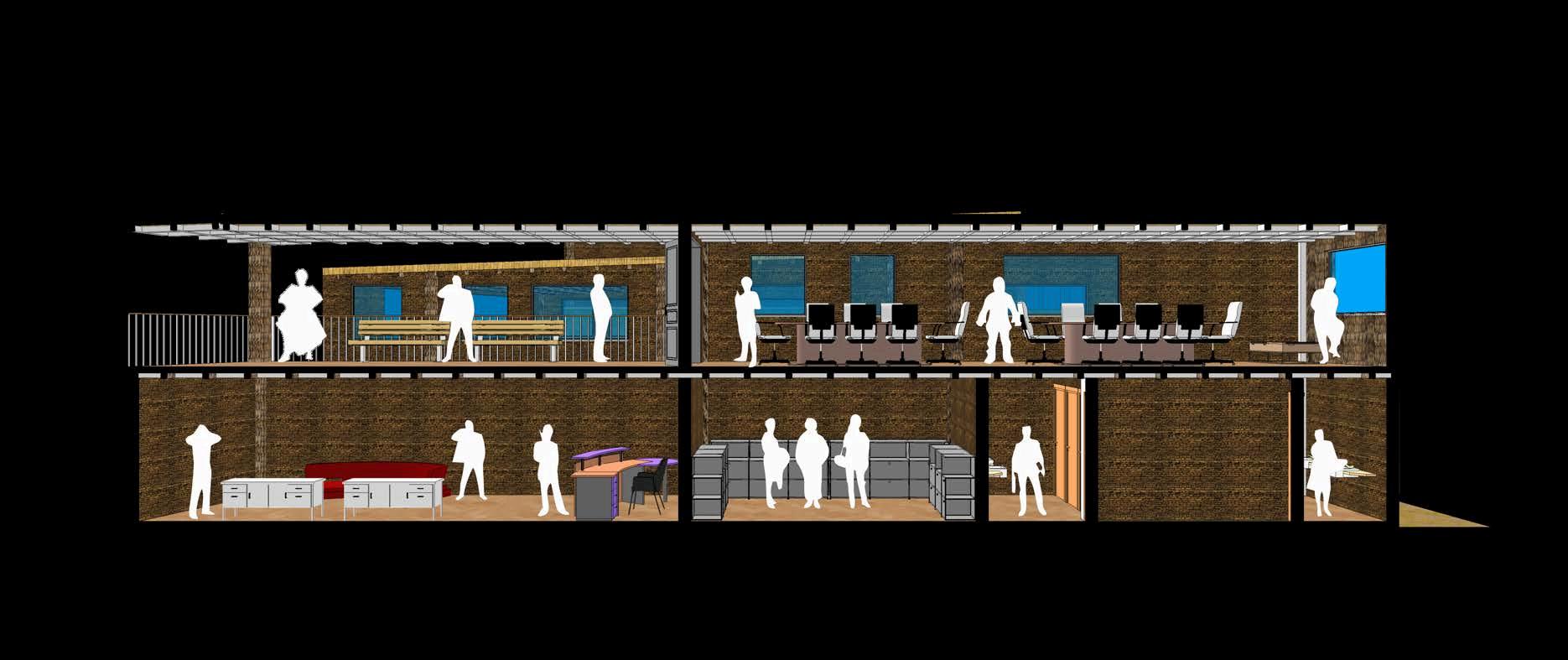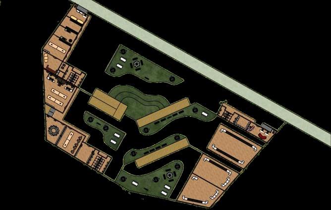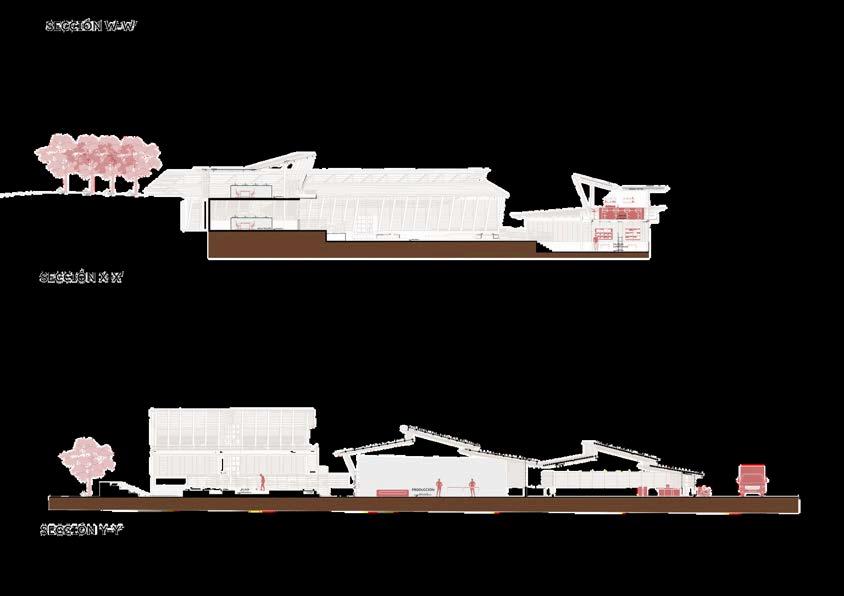 Lointeresanteesque,apesardeesta fragmentación en niveles, la espacialidadmantienesuunidadvisual y funcional. Esto se logra gracias a la disposición longitudinal de los bloques —comercio, procesamiento, dirección— que,aunqueseparadosporplataformas, conservan una lectura coherente como parte de un mismo sistema arquitectónico. Esta linealidad no es rígida:sepliega,seadapta,seeleva,se flexibilizaenfuncióndelterreno,loque le otorga un dinamismo espacial que enriquecelaexperienciadelusuario.