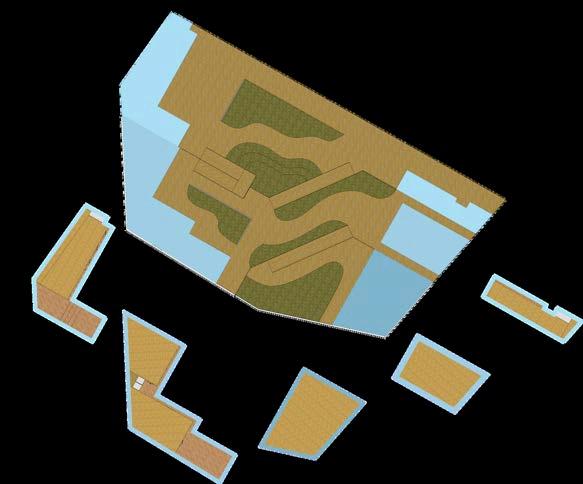 La espacialidad en esta parte del proyecto deja de ser plana o unitaria para convertirse en una secuencia de plataformasescalonadas.Cadaunode los volúmenes que componen el conjuntoseposasobreunniveldistinto, generandounaprogresiónespacialque responde al descenso del terreno natural.Estopermitequelaexperiencia de transitar el edificio se convierta en una especie de recorrido paisajístico, donde cada tramo ofrece una nueva relaciónconelentorno,conelusuarioy conelusoasignado.