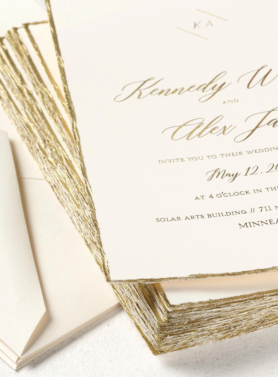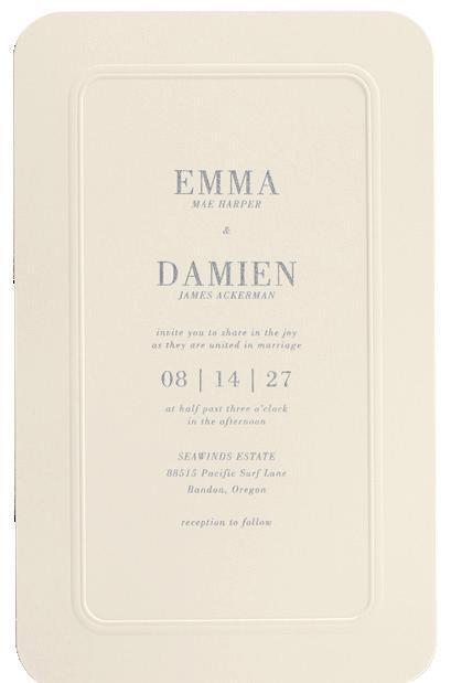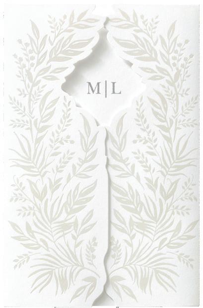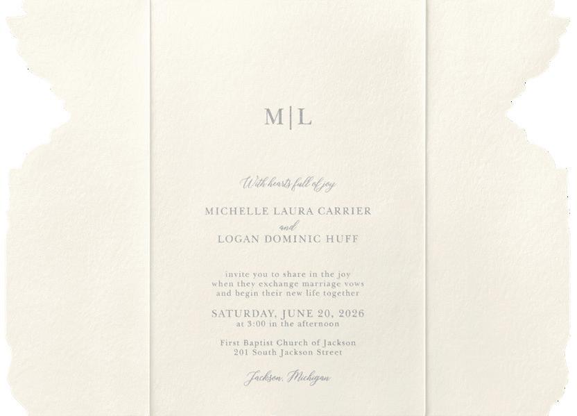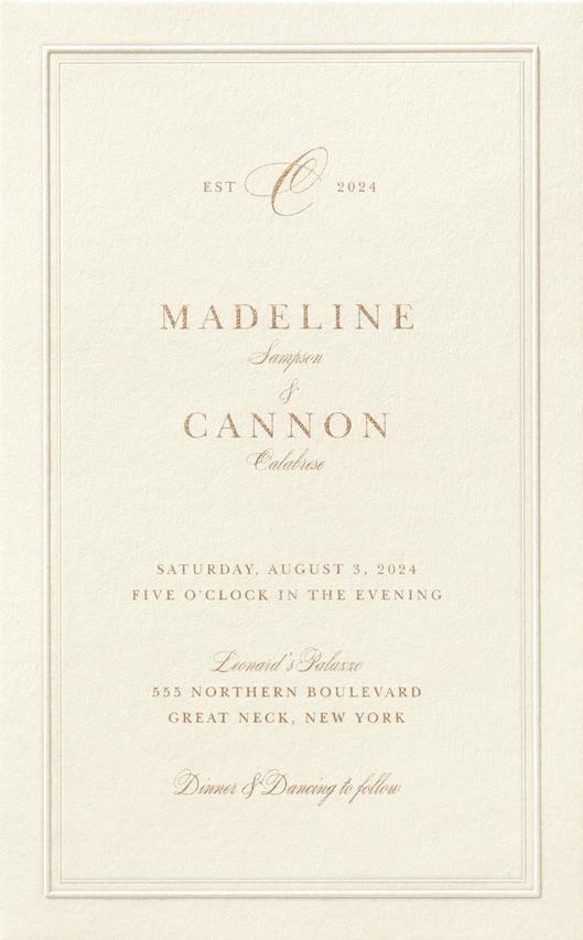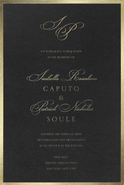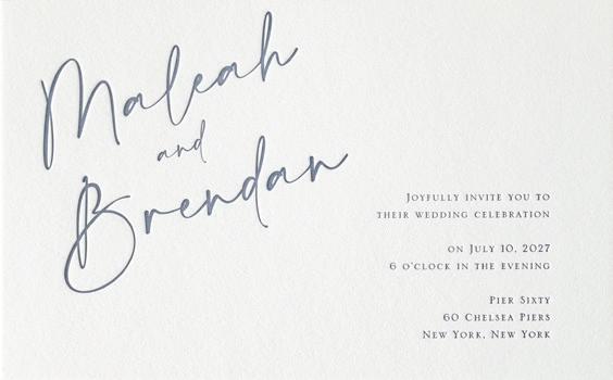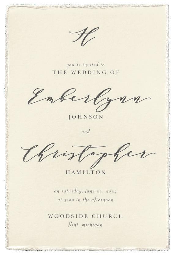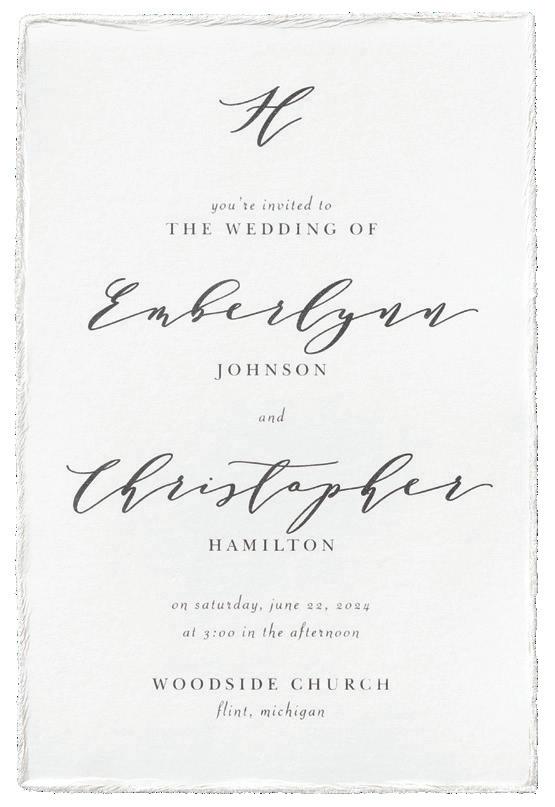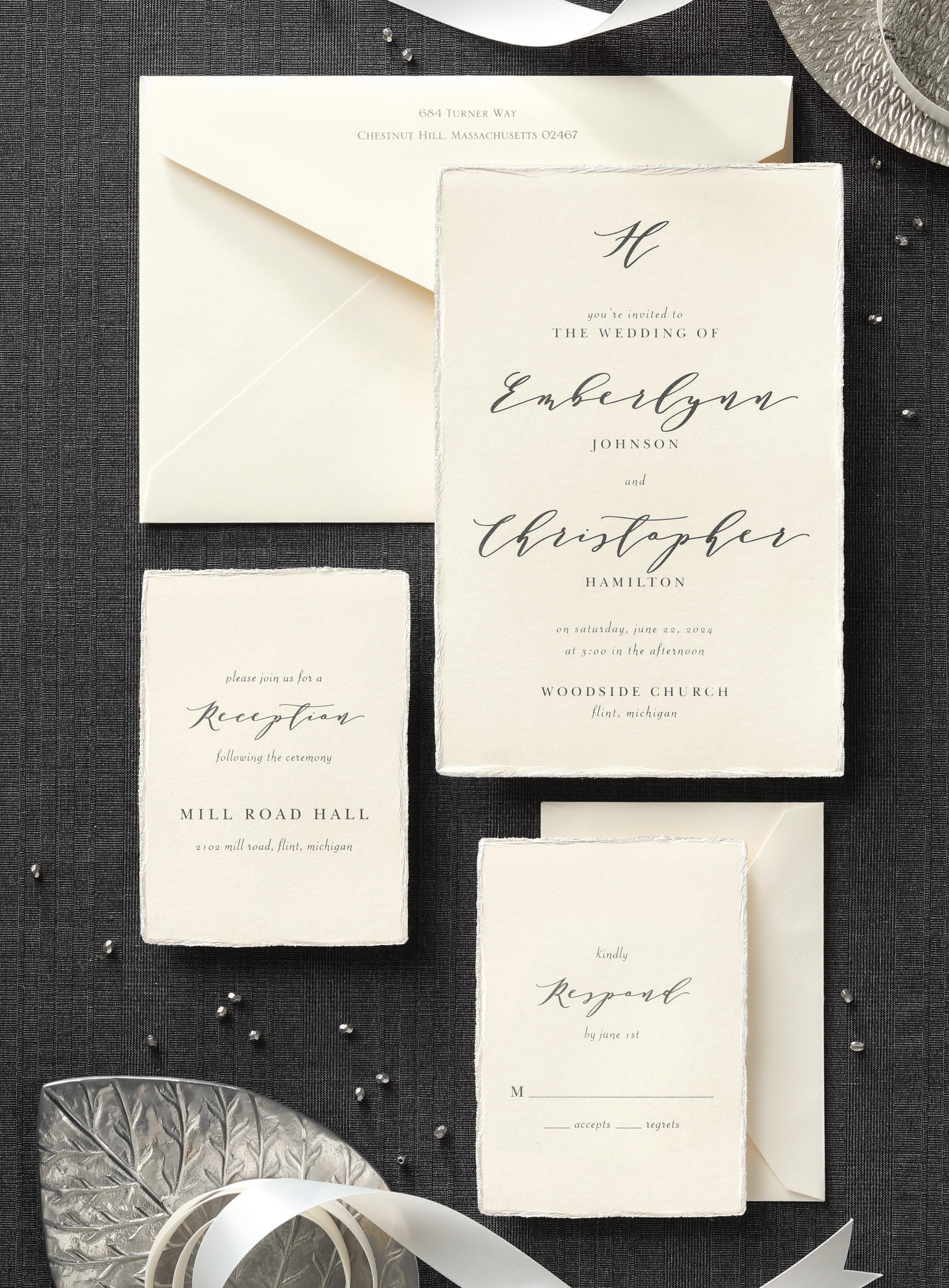 The Classic Collection is elegant and timeless, boasting aristocratic wording and elegant borders. The Collection’s beautifully embossed panel invitations are perfect for couples seeking an elegant and formal look. Its deckle edge cards capture the essence of old-world romance and feature sophisticated gold, silver or pearl foil accents. Couples seeking a simple layered look will love the Initial Impressions Invitation, which features their initials printed on an elegant wrap.