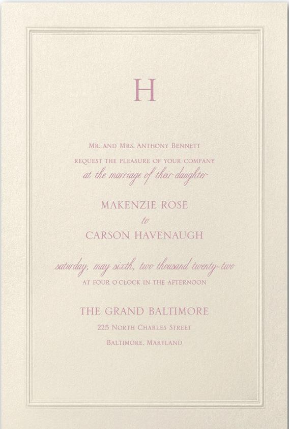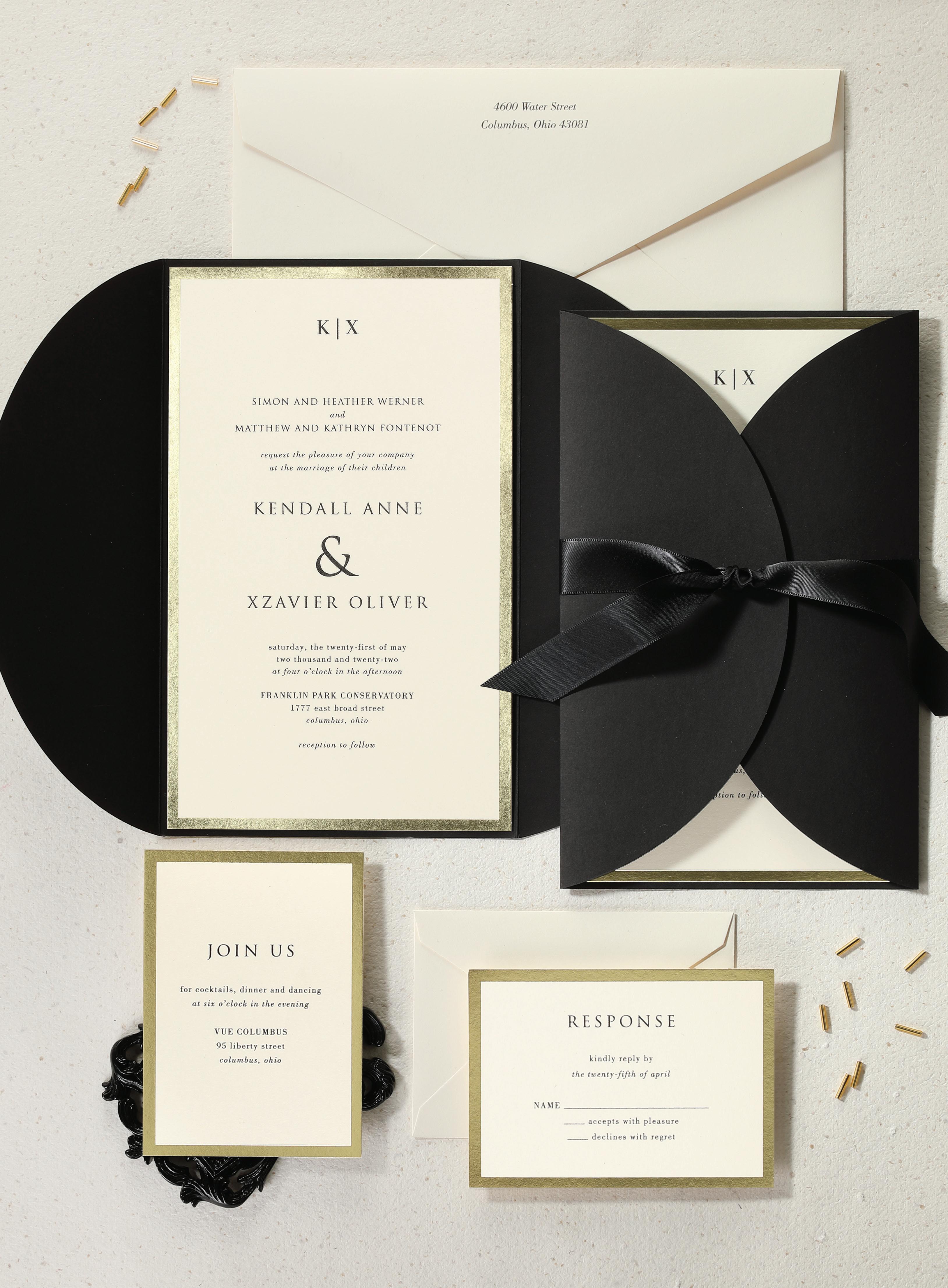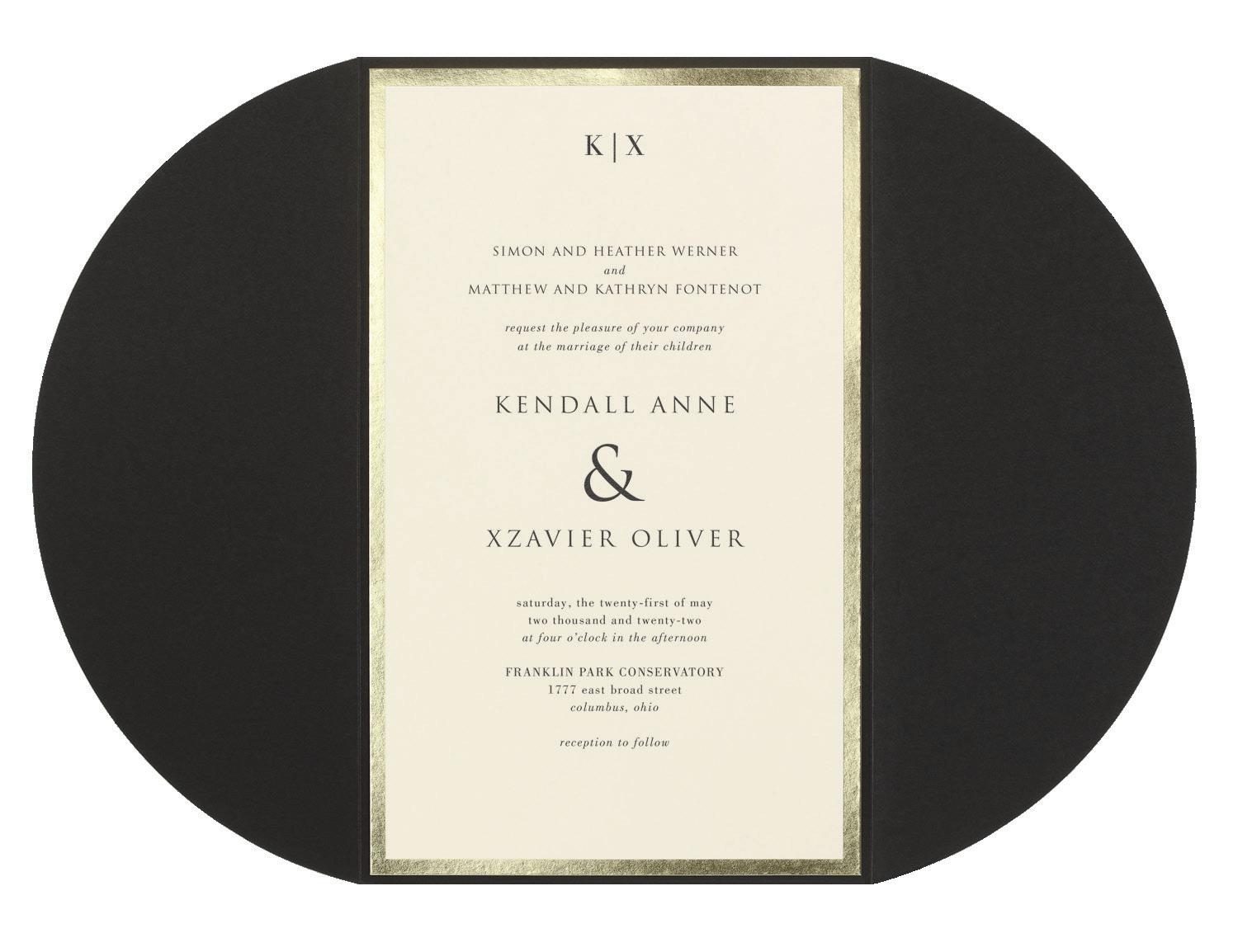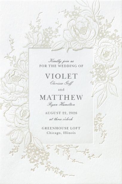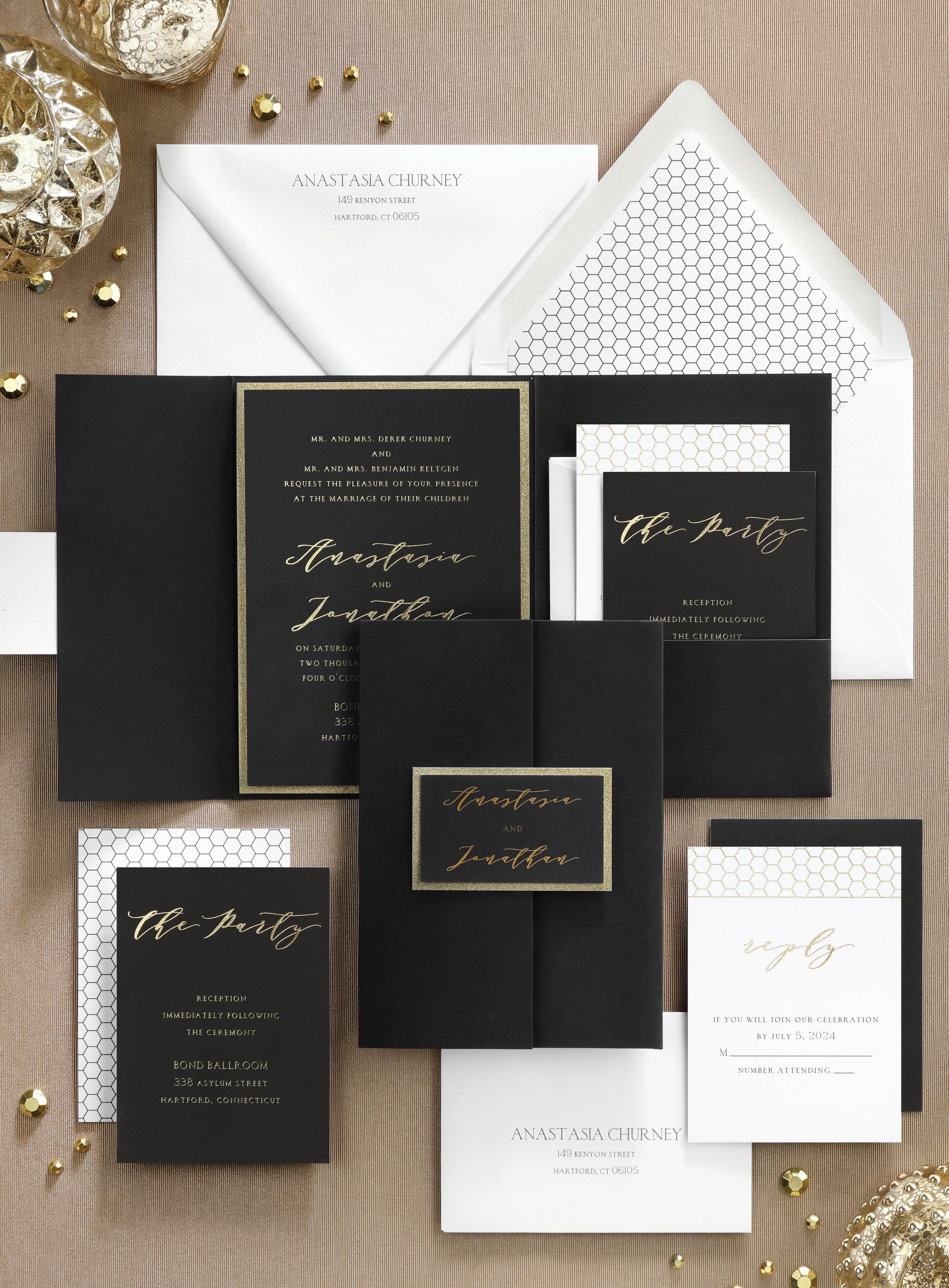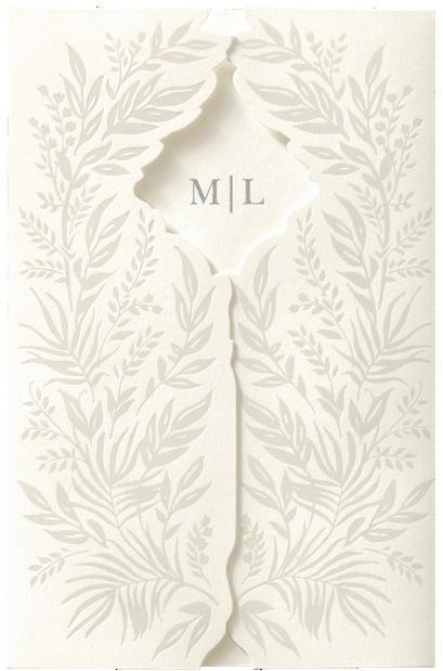 The Classic Collection is elegant and timeless, boasting aristocratic wording and elegant borders. The Collection’s beautifully embossed panel invitations are perfect for couples seeking an elegant and formal look. Its deckle edge cards capture the essence of old-world romance and feature sophisticated gold, silver or pearl foil accents. Couples seeking a simple layered look will love the Initial Impressions Invitation, which features their initials printed on an elegant wrap.