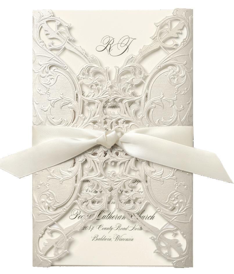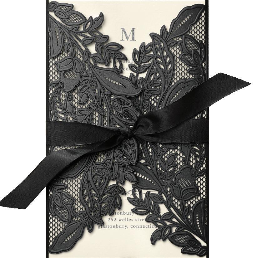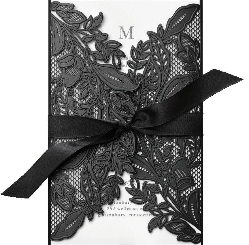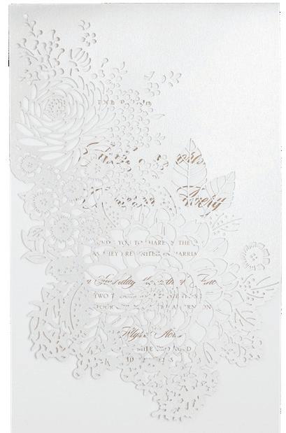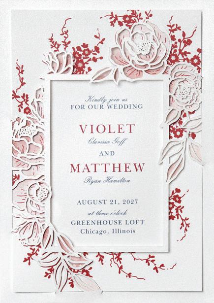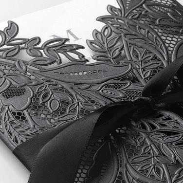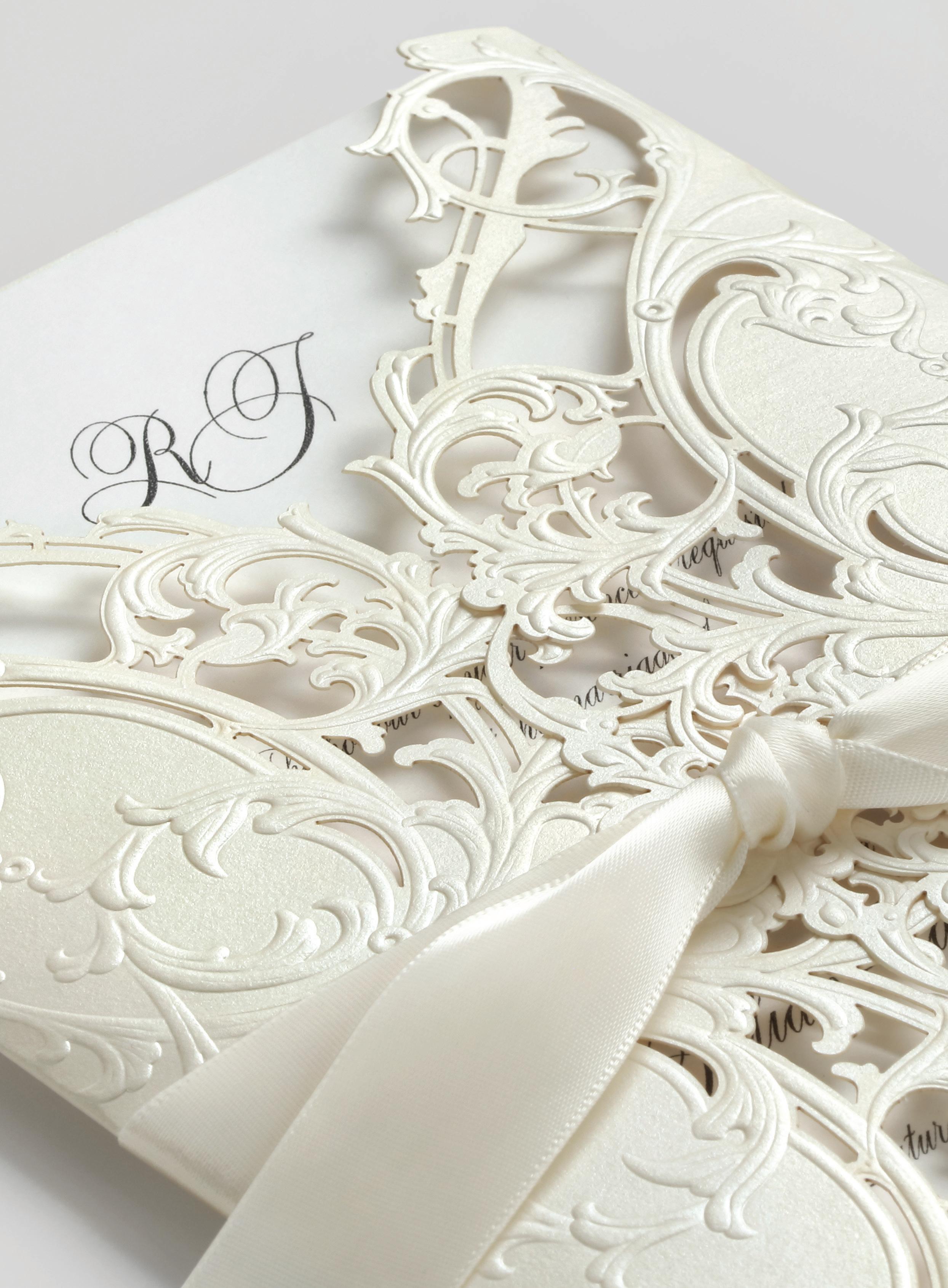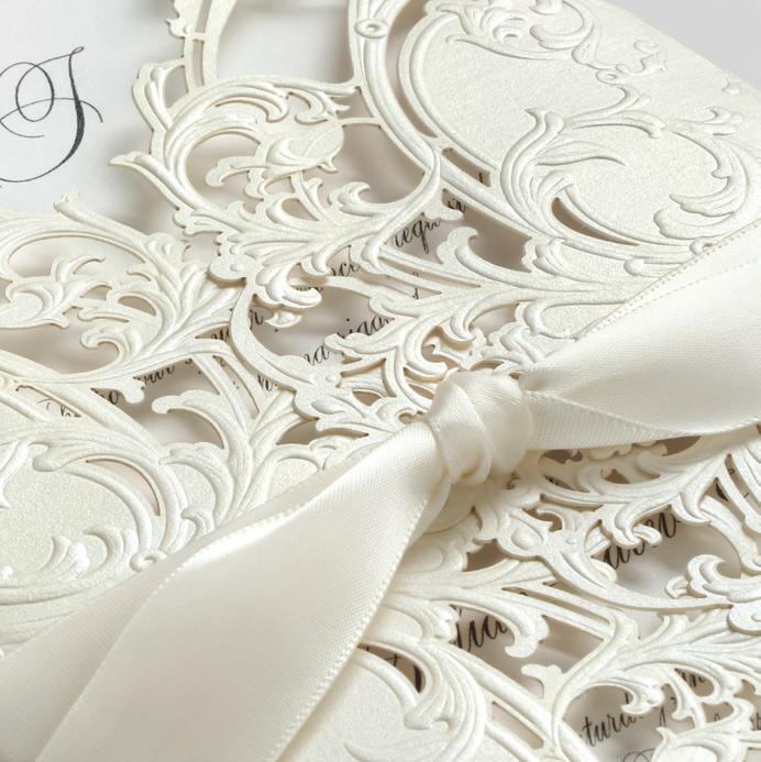 We created the Luxe Collection for couples who vow to have only the best. The Collection’s top sellers begin with large-size invitations and thick papers. Then, it enhances them with upscale additions like embossed designs, layers, ribbons, and wraps featuring intricate laser-cut designs. These invitations feature meticulous attention to detail that embodies luxury and refinement, ensuring a wedding day celebrated with unparalleled style and elegance.