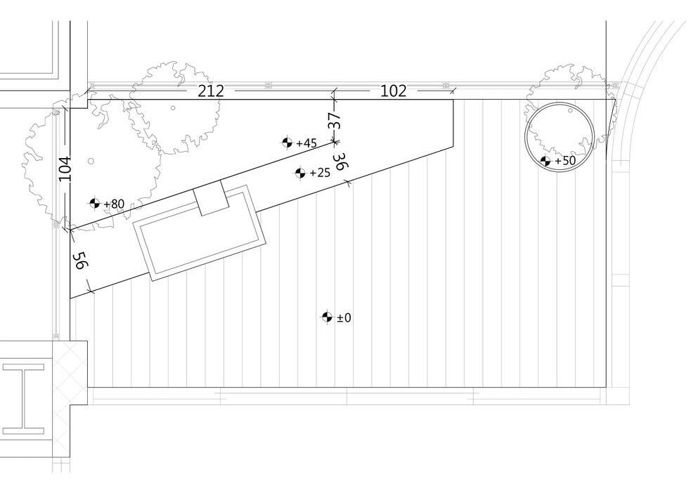The wooden chair combined with a white marble planter creates a clean, elegant, and warm ambiance. The addition of a small water pool with low pig troughs adds a lively and playful t ouch. Careful consideration is needed to determine the arrangement of each element's position.