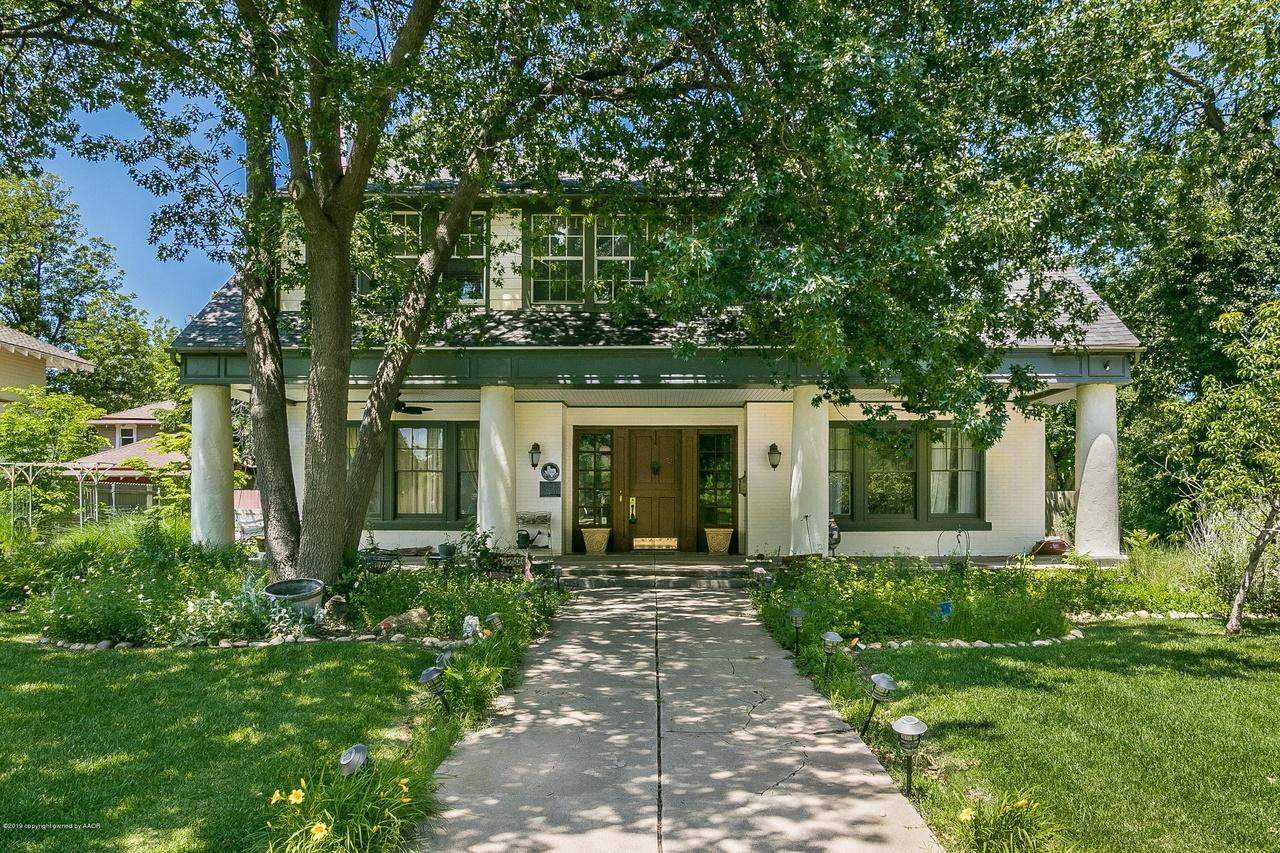 “In 1910, the Turners built this home modeled after Mary’s parents’ home in New Jersey …. One of Amarillo’s very few Dutch colonial revival homes, this two story side gable brick house has a full width porch with massive Tuscan columns and a large shed roof dormer. An original brick carriage house later became a guest cottage.”