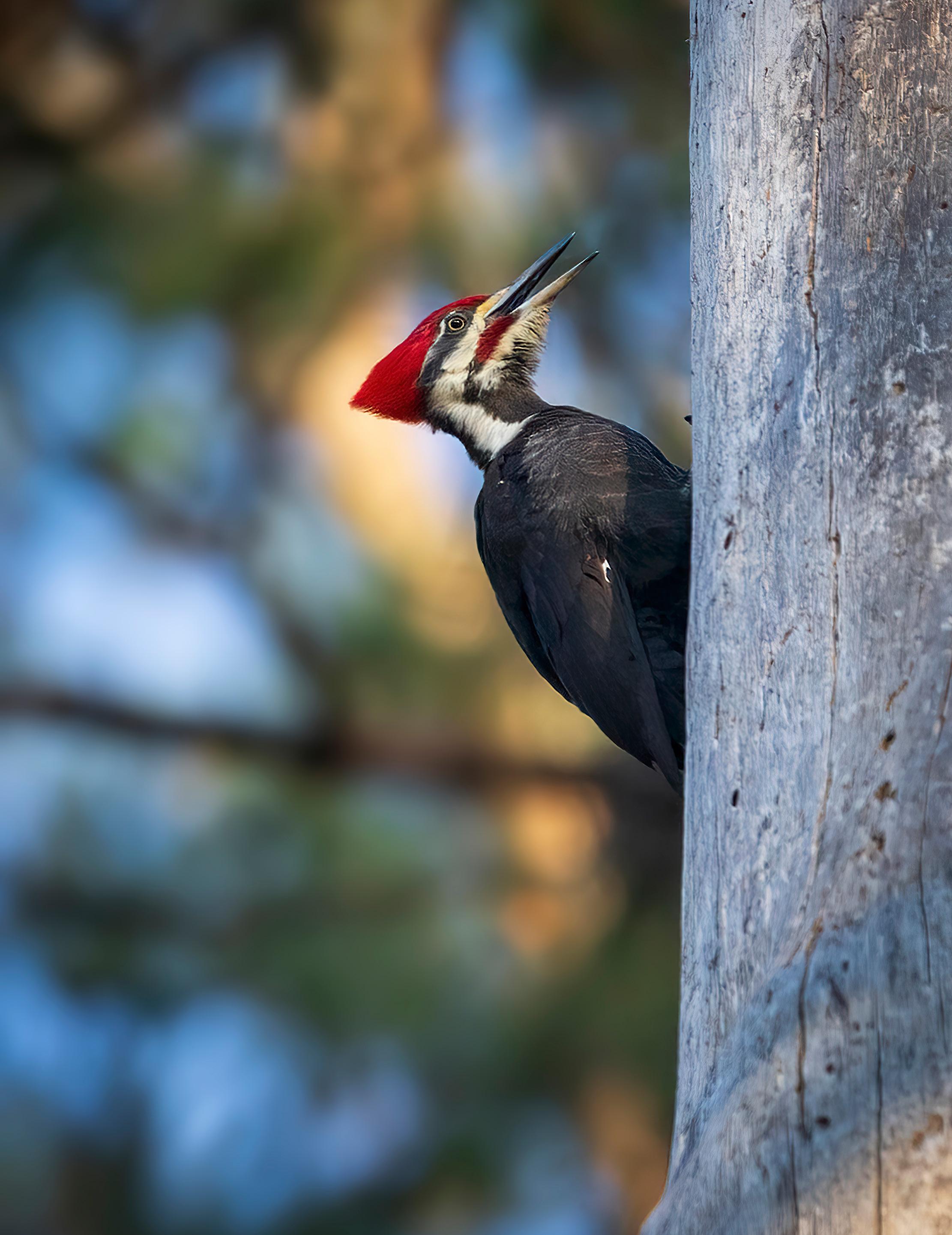 Spring is the most active time for the pileated woodpecker. Males, like this one, drum on trees to attract mates and claim territories.