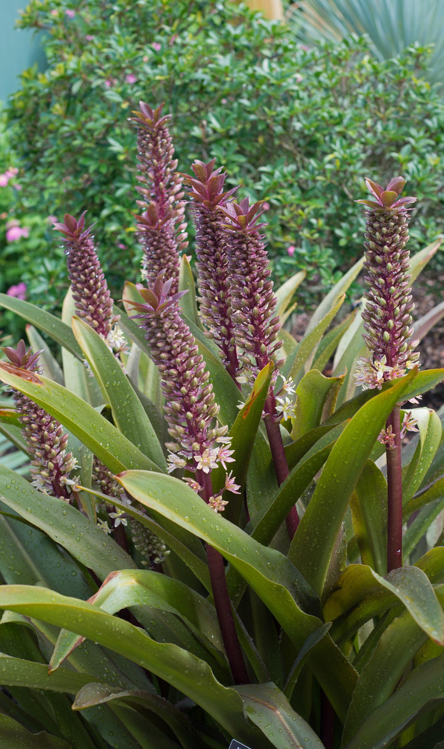 The cultivar ‘Sparkling Burgundy’ has long been the attractive poster child of pineapple lilies, and for good reason — this dramatic dazzler’s show starts with deep maroon leaves snaking from the earth (which can fade to an offgreen), setting the stage for bloom bursts of clustered stars tinged in purple. Want a subtler show? Opt for the cultivar ‘Reuben’ with rose-pink blooms on 18-inch-tall stalks embraced by modest green foliage.