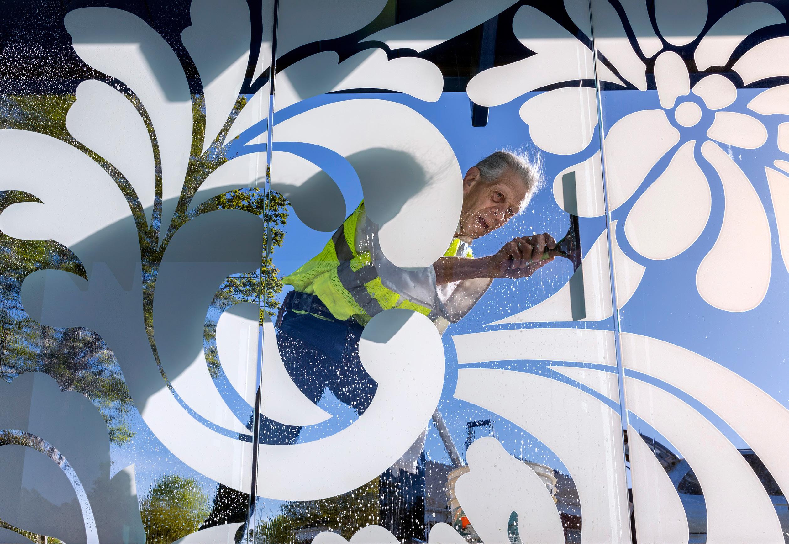 Window cleaner Donnie Rich squeegees the decorated glass of a bus stop shelter at High House Road and SE Cary Parkway. The lifelong Cary resident says he has cleaned Cary bus stop shelters for the past 16 years, averaging about 35 stops a week.