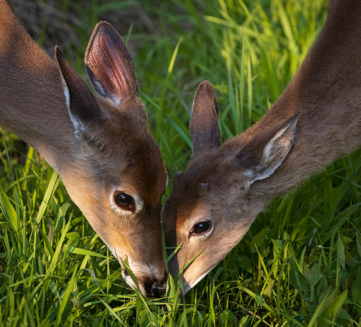 White-tailed yearlings show affection touching noses while grazing together.