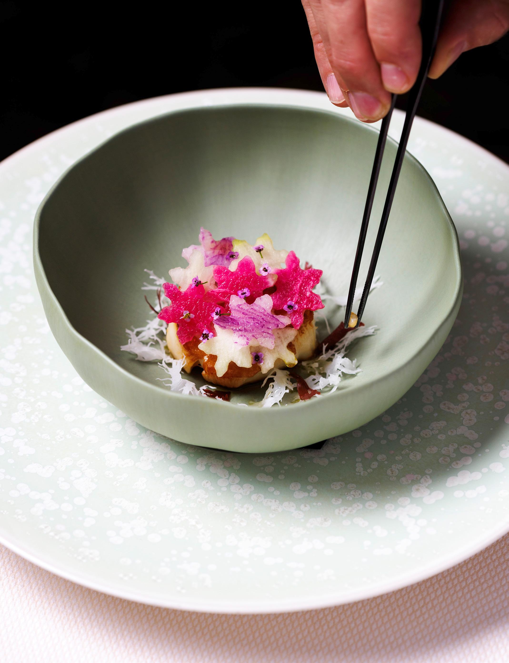 “The menu is based on curated pieces of art seen throughout the hotel,” Greene says. “I gain inspiration from the art and transform that onto the plate. Whenever a dish is served, it’s accompanied by a small easel along with a print. The server then explains what inspired me to create each dish.”