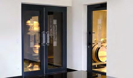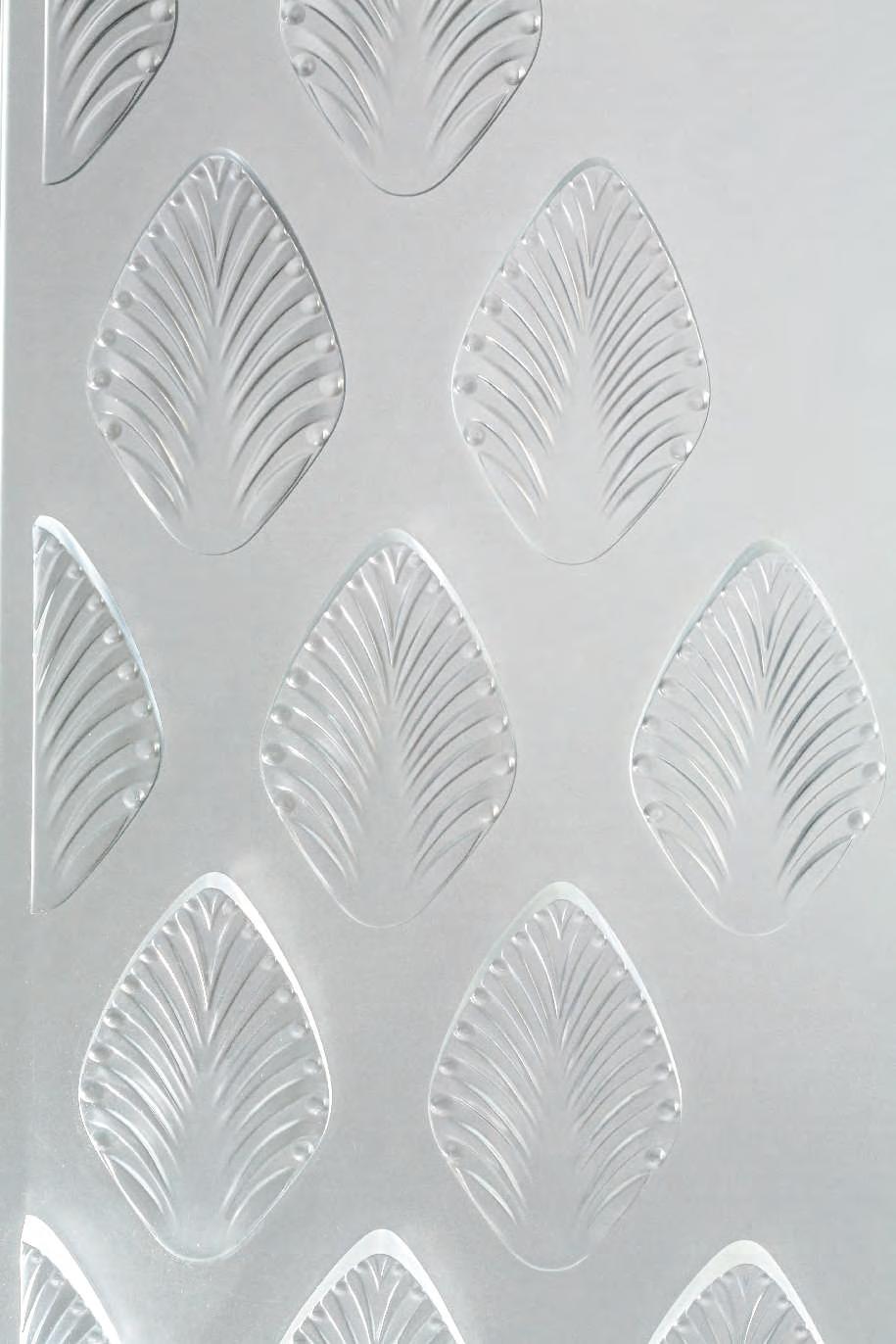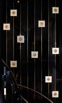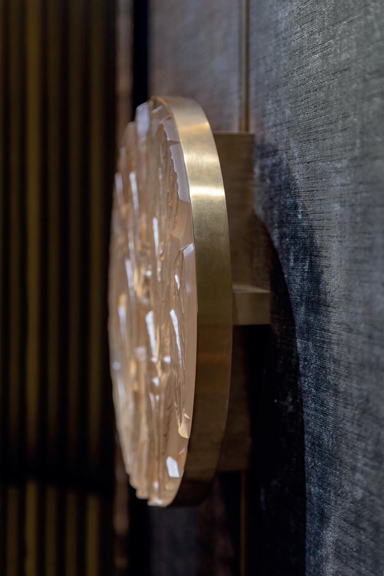 Patrick Hellmann et LALIQUE s’associent pour créer la Suite LALIQUE au Prince de Galles. Différents panneaux LALIQUE en cristal miroité et lustré or signent cet espace selon des intégra�ons différentes dans les meubles. Ce sont des inserts décora�fs de cristal. Panneaux décora�fs PETITES BULLES avec feuillure et RAISINS CENTRE sans feuillure, détail, photo Différents types d’inserts de panneaux décora�fs avec ou sans feuillure PANNEAUX DÉCORATIFS AVEC OU SANS FEUILLURE POUR CRÉER DES INSERTS DE CRISTAL CRÉATION SUR MESURE Panneau décora�f RAISINS miroité, lustré or, sans feuillure, collé dans un insert métal pour une intégra�on affleurant avec plateau de table. Quatre panneaux décora�fs RAISINS sont placés aux quatre coins de la table. Insert de métal non fourni par LALIQUE. Panneau décora�f PETITES BULLES miroité, lustré or, avec feuillure, collé directement dans les angles de la structure du canapé pour une inser�on en relief. UNE POIGNÉE DOUBLE CIRCULAIRE – dressing masculin, Paris, projet réalisé, photo