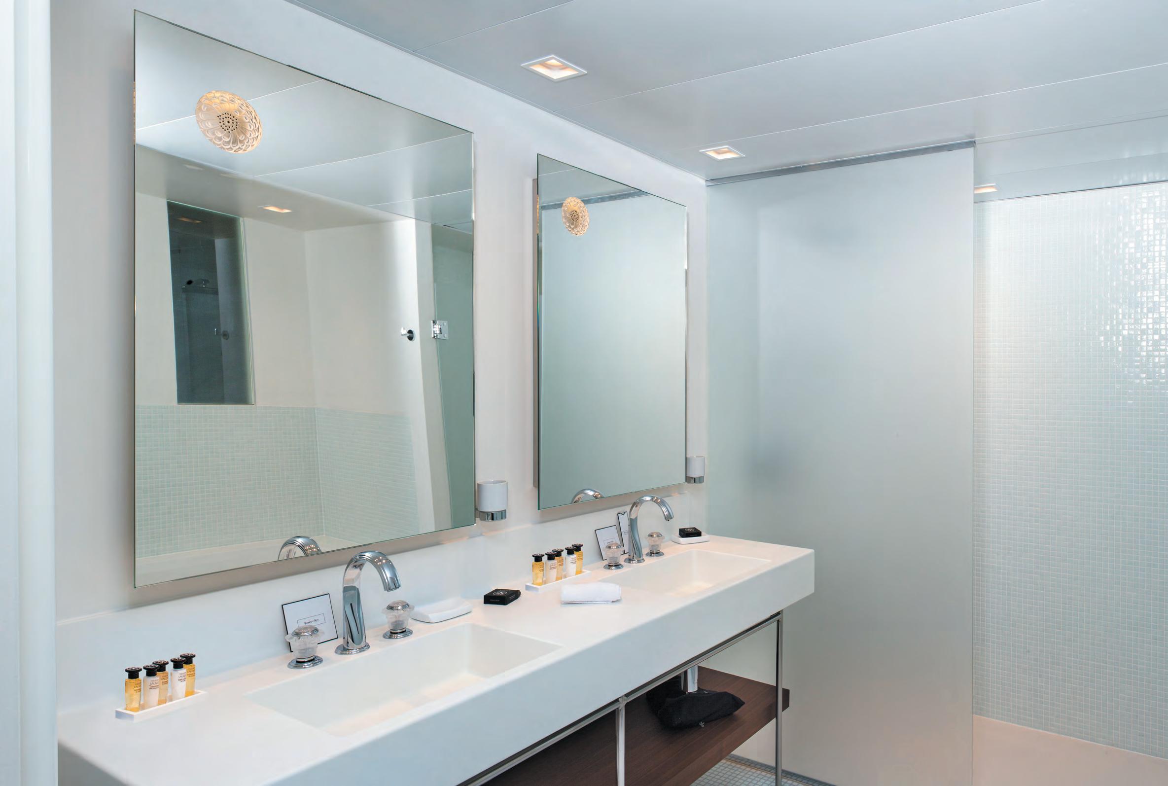 Features of this bedroom cabin are DAHLIA panels fitted to luminous walls at the head of the bed and overhead, as a skylight. Relax or wake up according to the brightness and colour of the diffused light. The rest of the room is plain. Only the outlines of the furniture are picked out by the sparkle of an ASTER crystal, fitted as an inlay.