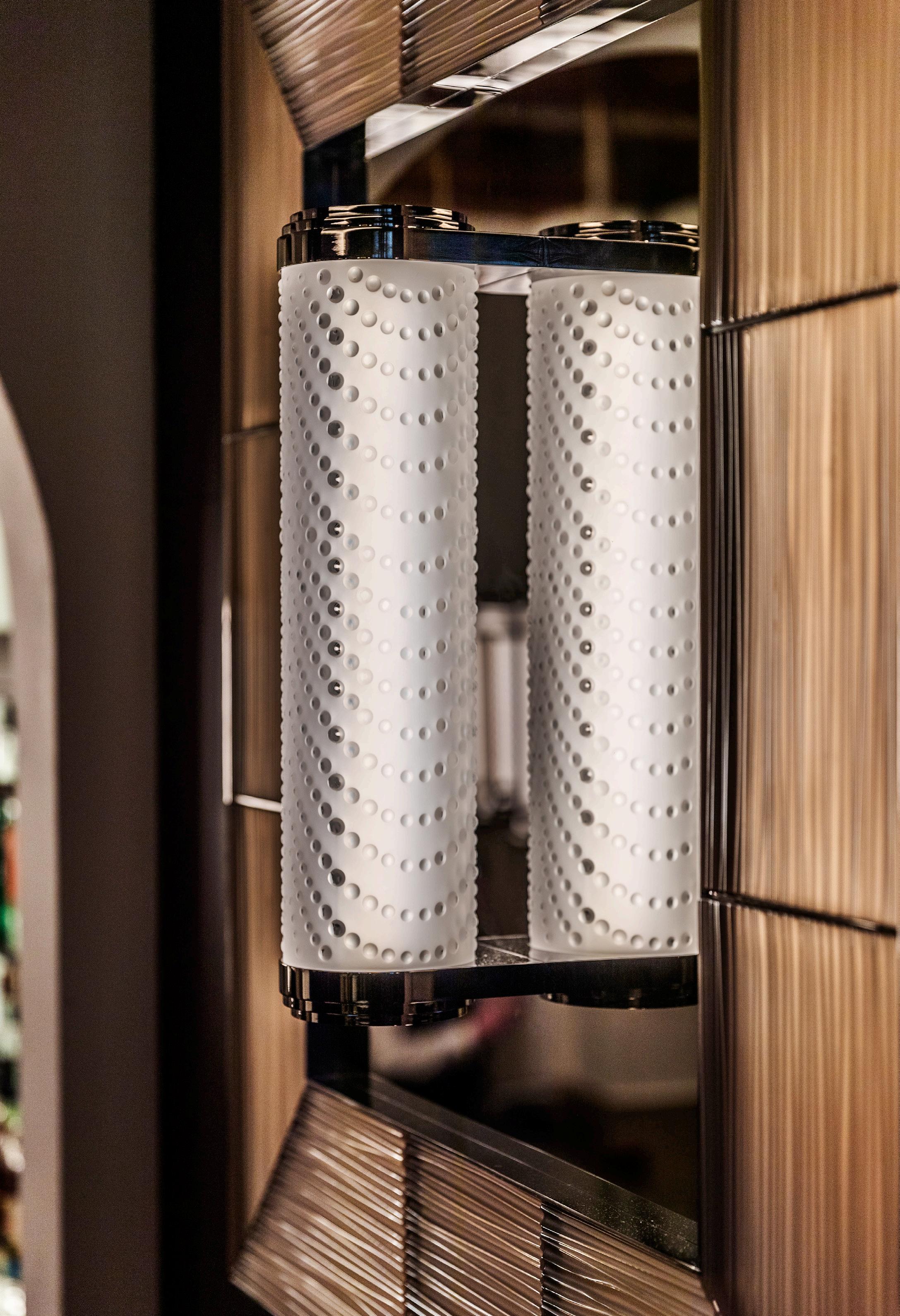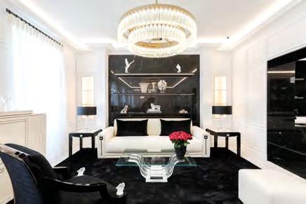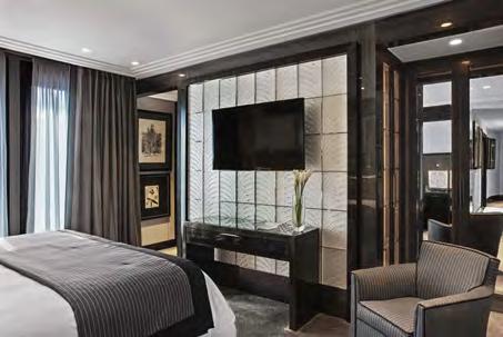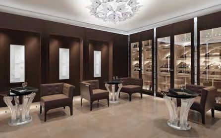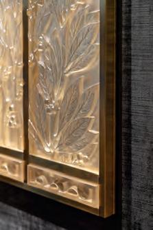 Patrick Hellmann and LALIQUE have partnered to design the LALIQUE Suite at the Prince de Galles. Different LALIQUE panels in mirrored crystal and gold luster, sign this space according to different integra�ons in the furniture. These are decora�ve crystal inserts.