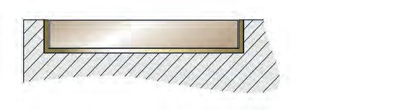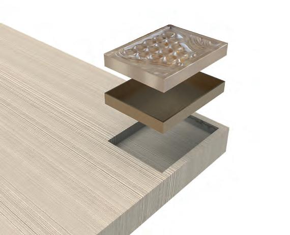 Mirrored RAISINS decora�ve panel, gold luster, without rabbet, placed in a metal insert for flush integra�on with table top.