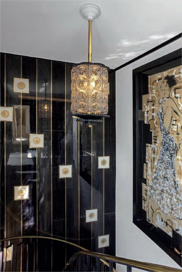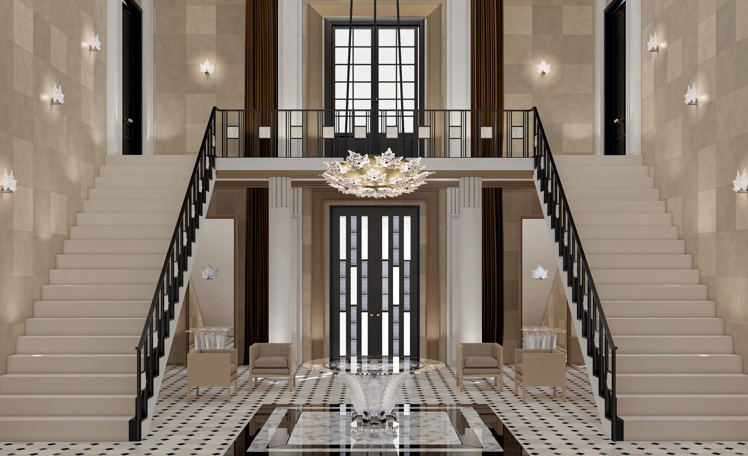 The emblematic crystal panel MASQUE DE FEMME decorates a balustrade in the hallway of this villa. Inspired by the SOUDAN motif, the majestic entry door announces the exceptional character of the place. The DÔME becomes a chandelier.