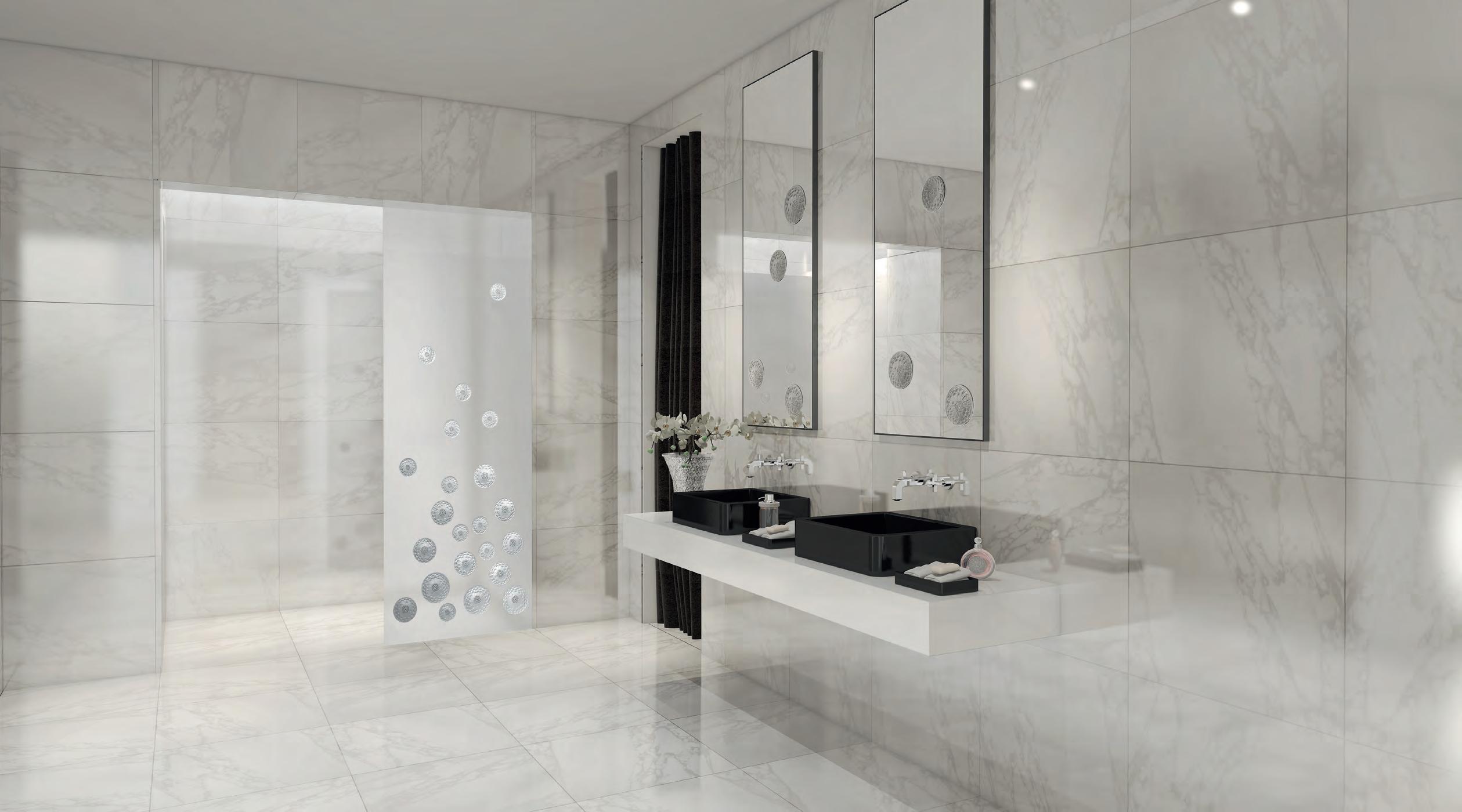 Tempered extra-white glass, satin finish, with DAHLIA crystal elements