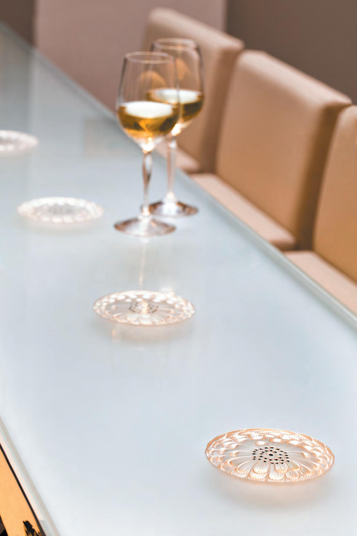 Integrated into a backlit table top, the BOUQUET transforms an ordinary dining table into an expanse of light. Mounted in black-lacquered frames and illuminated, René Lalique’s MERLES ET RAISINS panels radiate pure poetry. In the foreground, the VENISE crystal in the middle of each backrest sets off the velvet upholstery of the chairs.