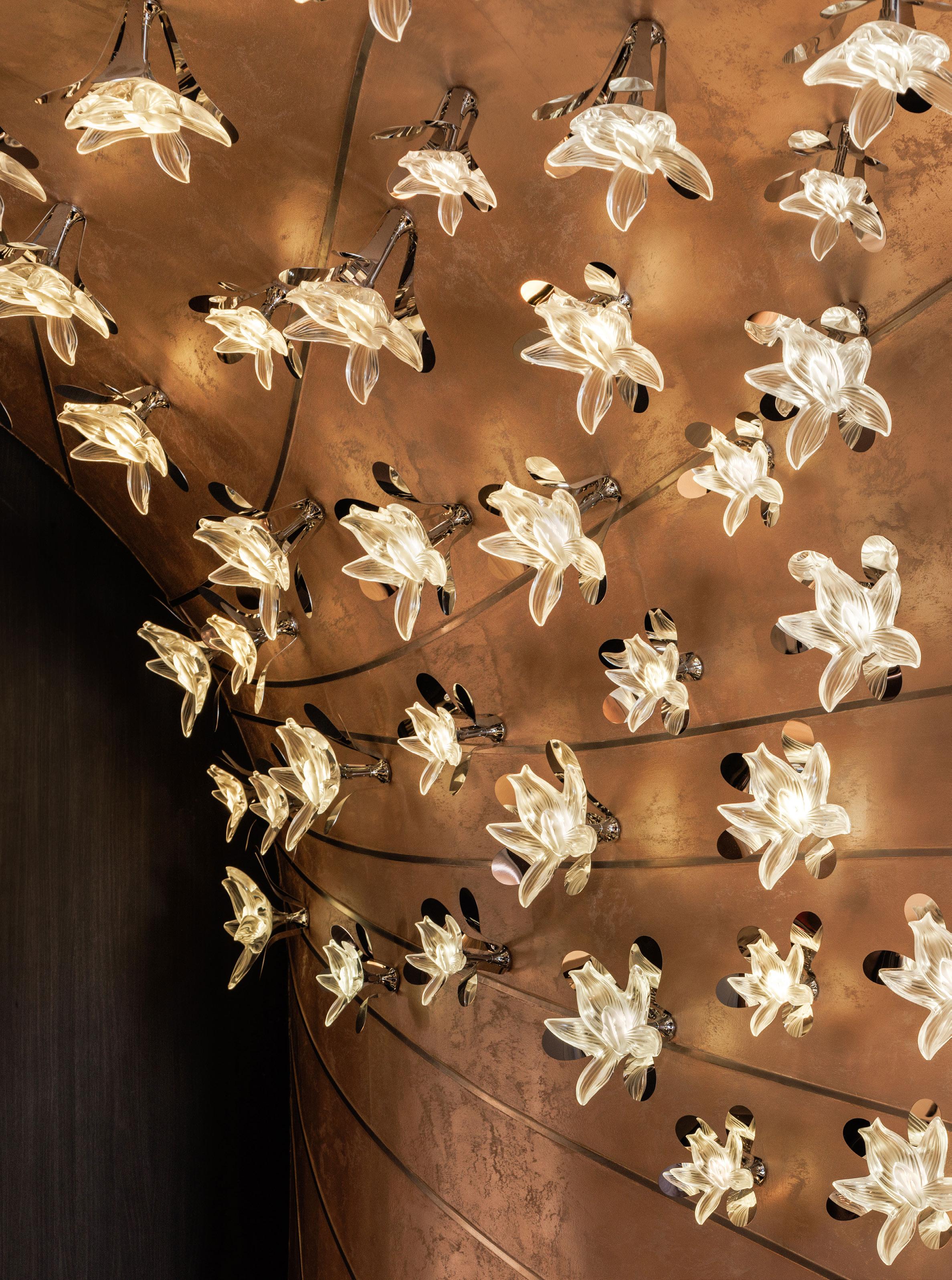 These crystal CLOVERS wall sconces were specially created by LALIQUE INTERIOR DESIGN STUDIO for the new Mikimoto Boutique in Tokyo, Japan. Inspired by the clover, emblem of the famous jeweller, LALIQUE developed this set of crystal CLOVERS to adorn the entrance of the 6th floor of the building, dedicated to the bridal collection. Positioned in front of the CLOUD OF CLOVERS light sculpture, these wall sconces spread on the wall like a constellation.