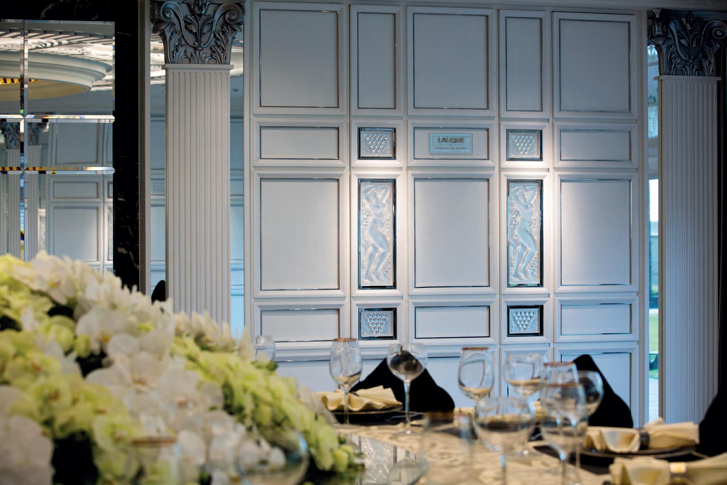 Patrick Hellmann and LALIQUE have partnered to design the LALIQUE Suite at the Prince de Galles. In the dining room of the Suite, a bar welcomes guests with gold luster FEMME BRAS LEVÉS and FEMME TÊTE LEVÉE decora�ve panels surrounding a mirror.