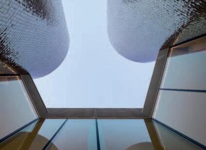 Cet effet a ensuite été encore davantage mis en valeur avec le pavillon Vanke à EXPO Milano 2015, où le volume plastique en spirale torsadée de la construction était également souligné par la couleur raffinée rouge laque (spécialement produite par le laboratoire de teinture de Casalgrande Padana) de la dalle de revêtement utilisée selon une structure complexe en écailles superposées, quasiment pour évoquer un grand dragon oriental, immobile et silencieux. En octobre de la même année, le long de la route Pedemontana qui relie Casalgrande à Sassuolo, on inaugurait le grand monolithe « The Crown ». Ce dernier a été conçu par Daniel Libeskind pour enrichir cette sorte de système d’épisodes iconiques et monumentaux, promus par Casalgrande Padana et répartis sur le territoire aux côtés du « Ceramic Cloud », le nuage géométrique magique servant de porte d’entrée ouest du district céramique conçu par Kengo Kuma et situé à proximité. D’une hauteur semblable à celle d’un bâtiment de cinq étages, « The Crown » se dresse dans la plaine et joue le rôle d’un point de repère. Ici aussi, la dalle Fractile qui couvre une surface de trois cents mètres carrés, participe à valoriser du point de vue expressif et de la matière le développement dynamique ascensionnel et enveloppant de l’ensemble de la figure géométrique et sculpturale.