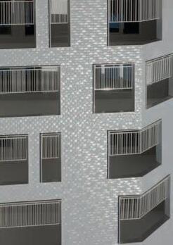 En relisant et en réinterprétant la typologie de la cour ouverte, à travers un programme de composition dicté par la segmentation et par un mouvement géométrique contrôlé des façades, les résidences Libeskind, développées sur quatre à treize étages avec le couronnement marqué par la série de « villas suspendues », ont trouvé dans les dalles en grès cérame de Casalgrande Padana le matériau capable de participer à la valorisation des solutions des façades. L’analyse modulée de l’évolution régulière de la peau architecturale enveloppe l’ensemble de la construction, en soulignant les mouvements brusques, les discontinuités élaborées, les coupes en diagonale, suivant dans le détail la géométrie précise de l’ensemble. La façade ventilée des solides parapets et des terrasses qui caractérisent de façon éloquente le dynamisme des fronts a suivi un schéma de pose attentif et équilibré en mesure de répondre aux exigences bespoke du projet.
