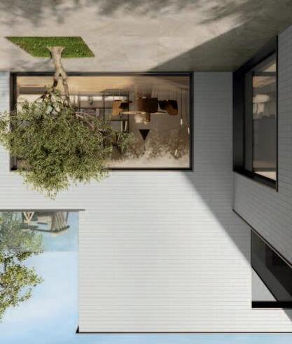 Cette coquille revêtue de dalles vertes diamantées - produites, également à cette occasion, spécialement par Casalgrande Padana (Diamante R20 vert émeraude) - unit l’extérieur et l’intérieur en se poursuivant avec la même finition dans les espaces couverts.