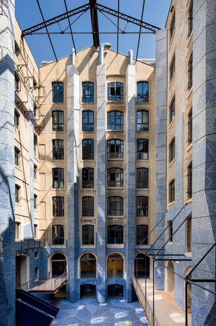 Nei Docks marsigliesi si attiva un processo di ‘benefica intrusione’, di felice contaminazione, di calibrata sovrapposizione tra le pietre dei fronti compatti dell’edificio storico trasformato e il contrappunto dato dai nuovi interventi di ceramica policroma che caratterizzano le corti crescendo dal basso verso l’alto come un magico rampicante vegetale tradotto in forma architettonica. Nei Docks le lastre in gres porcellanato romboidali “Edera” impiegate per una delle corti sono state ottenute tramite un tampone ricavato da un calco in gesso modellato dal maestro ceramista Danilo Trogu attraverso un processo che ha saputo unire in modo sinergico e virtuoso il gesto artistico manuale con la produzione seriale, l’artigianato all’industria. Per un’altra corte le lastre di Granitogres a varie tonalità di blu, azzurri e bianco sono state posate in frammenti a mosaico ricomposti, fissati come nel caso della prima corte, ad una sottostruttura metallica di sostegno. L’effetto è stato quello di sperimentare una sorta di sovrapposizione e di simbiosi materica con la pietra delle facciate storiche che non è celata dal nuovo intervento, ma che piuttosto ne è ‘attivata’ in un confronto sinergico e virtuoso.