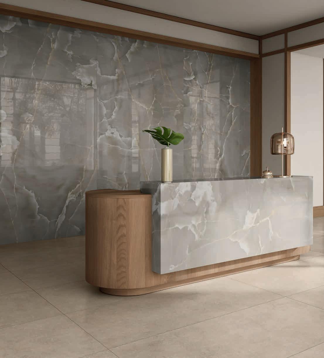 Onici di Casalgrande Padana: il prezioso materiale lapideo tradotto nelle prestazioni del gres porcellanato.