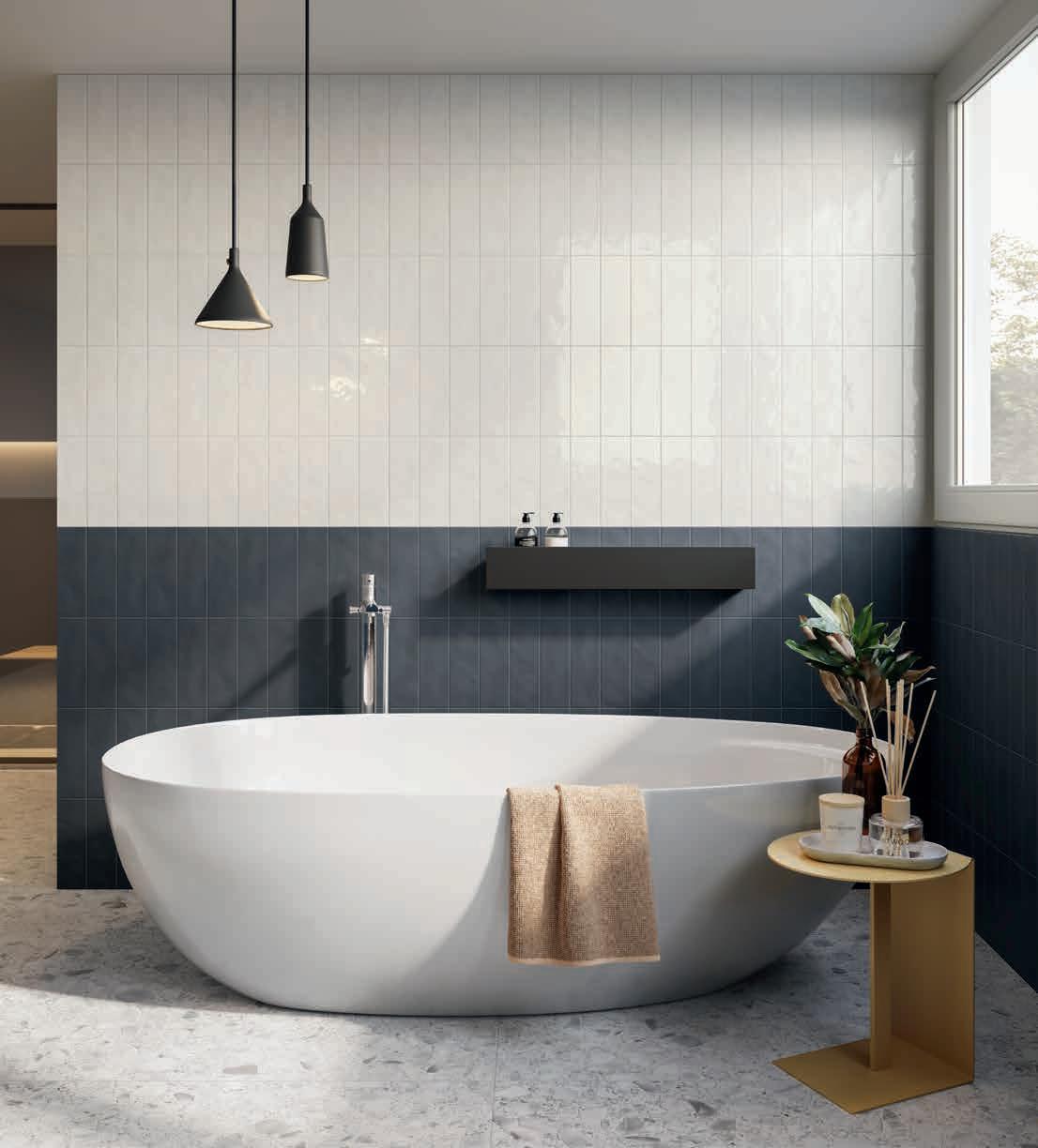 The Nuances collection comes in eight colours and two finishes (satin and lux). Snow white complements petunia black, while two shades of grey go with shades of green-sky blues. These solid colours emphasise the shape of these tiles, allowing for several layouts. For example, you can choose a horizontal staggered pattern, like an exposed brick wall, or a stack bond pattern, either vertical or horizontal.