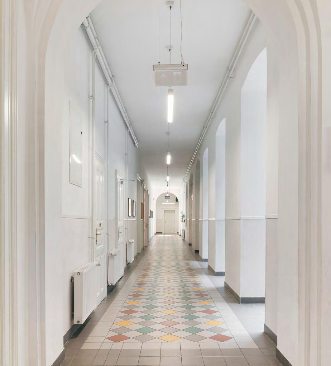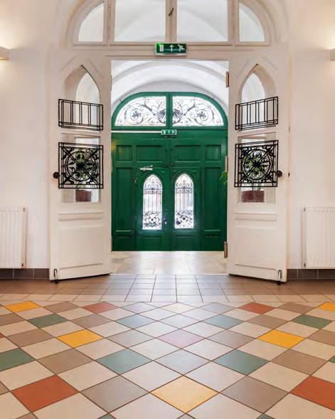 Die Keramikverkleidung dient dazu, die regelmäßigen Linien des architektonischen Grundrisses und der inneren Räume und Wegführungen zu unterstreichen. Die unterschiedlichen verwendeten Formate schaffen eine gelungene Abwechslung und ergeben eine komplexe Umgebung, die hervorragend auf die architektonische Struktur abgestimmt ist. Die für die Innenbereiche gewählte Verkleidung zeugt von einer anspruchsvollen Ästhetik, die für ein öffentliches Gebäude ungewöhnliche Qualitätsmerkmale mit sich bringt.