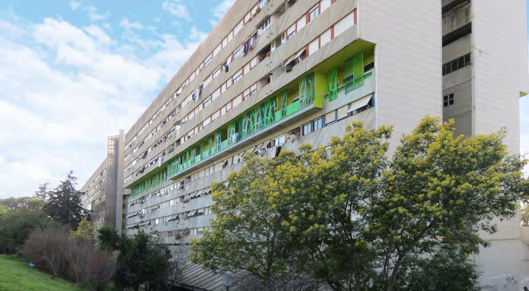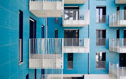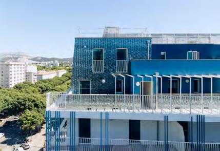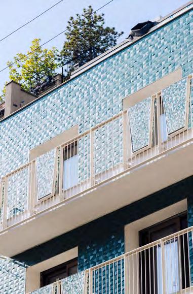 Pour l’utilisation polychrome du revêtement céramique de façade capable de contribuer à la nouvelle qualité des logements en se fondant dans le bleu du ciel.