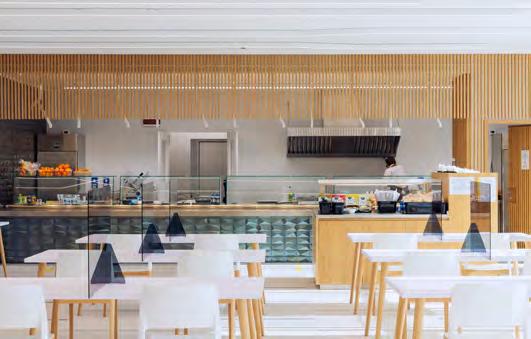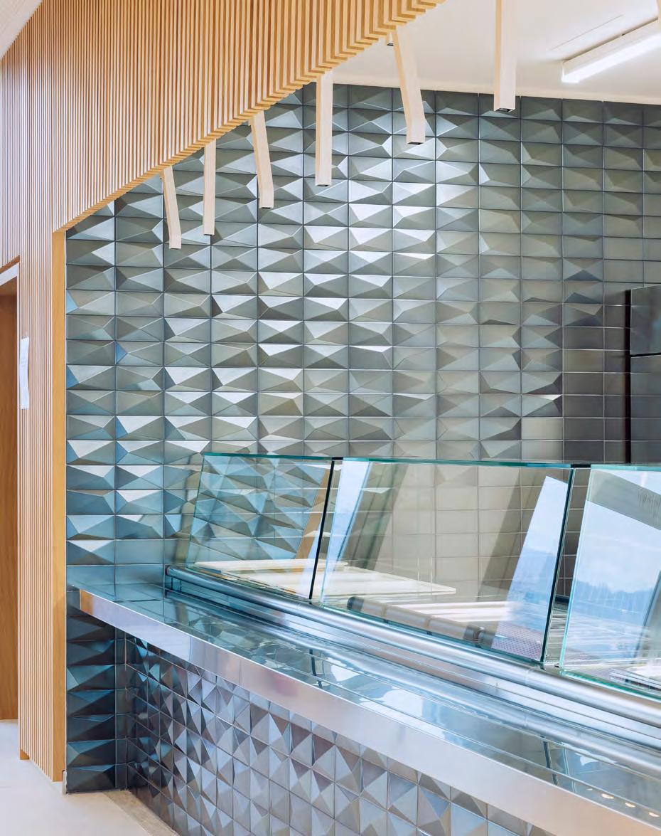C’est le cas du comptoir et de l’espace où les repas sont distribués dans la cantine du nouveau siège et du pôle logistique Vimar à Marostica dans la province de Vicence que l’Atelier(s) Alfonso Femia a réalisés entre 2015 et 2022. La construction de la cantine est liée au développement de la seconde étape du projet : réalisation des espaces dédiés à la production, aux bureaux et aux services, dont justement la cantine de l’entreprise et les salles de réunion. Dans l’espace lumineux de la cantine, une structure réussie composée de listels en bois naturel sur toute la hauteur délimite le mur de distribution des repas en self-service. Au niveau du long comptoir de distribution des repas, cet écran en bois s’interrompt pour accueillir l’îlot consacré à la nourriture. Ce dernier se caractérise par l’utilisation de la dalle en pointe de diamant couleur argent de Casalgrande Padana qui, couvrant la partie frontale du comptoir, se poursuit sur tout le mur d’appui latéral. Cet élément complémentaire vise à définir la figure matérielle de l’ensemble de la partie opérationnelle de la cantine et à insister sur ce point, en prenant l’aspect, pas seulement fonctionnel, de pièce maîtresse.