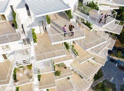 Jede Terrasse ist als eigener Pleinair-Bereich mit einer Mindestfläche von 7 Quadratmetern und einem Vorsprung von 7,5 Metern konzipiert. In dem Gebäude befinden sich mehrere öffentliche Räume: vom Erdgeschoss, in dem sich eine Kunstgalerie befindet, bis zur großen überdachten Terrasse mit einem Café, das von der Stadt genutzt werden kann. Die Folie architecturale dell’Arbre Blanc ist Teil einer städtischen Tradition, die seit dem 18. Jahrhundert zahlreiche Wohngebäude für das Großbürgertum und die verbliebene Aristokratie hervorgebracht hat, die Folies Montpelliéraines genannt werden (Château de Flaugergues, Château de la Mogère, Château d’O, um nur einige zu nennen), darunter auch Folie dell’Arbre Blanc, deren Bodenbeläge von Casalgrande Padana im Innenbereich im Zeichen der historischen Kontinuität stehen.