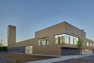 Le volume qui émerge à l’entrée du complexe sportif devient l’élément de référence et se détache dans la campagne, se colorant au gré des différentes lumières du jour et des saisons. Das aufsteigende Hauptgebäude wird zum markanten Element, das zum Eingangsbereich des Sportkomplexes ausgerichtet ist und in den Farben des Tages- und Jahreszeitenwechsels aus der Landschaft ragt.