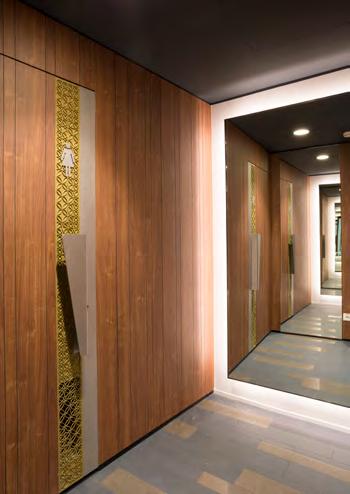 Die gelungene Gestaltung einer geometrischen Verkleidung und der Materialmix des als modernes zusammenhängendes Mosaik gestalteten Fußbodenbelags der Toilettenräume.