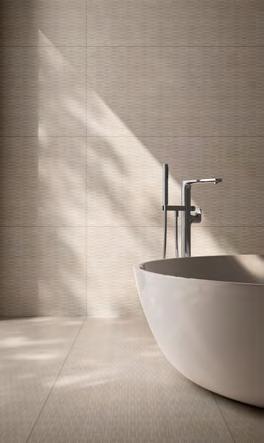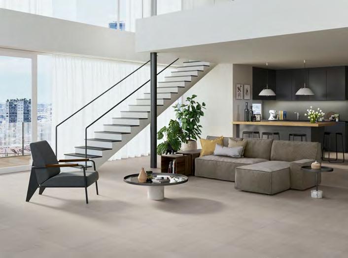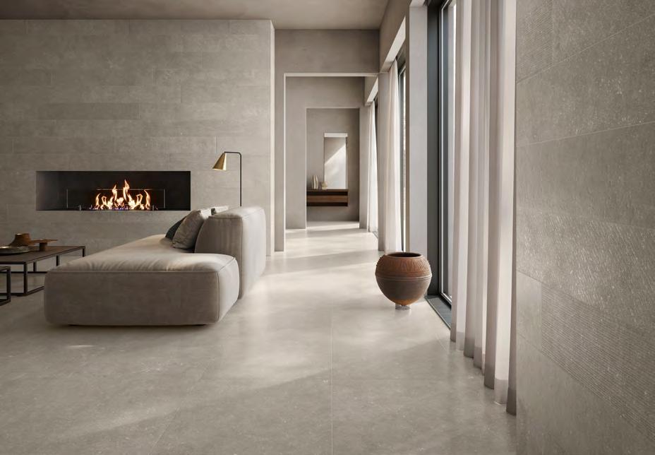 natürlichen Merkmale der Äderung und des Glanzes des Steinsalzes auf Platten überträgt und sie in einer harmonischen Farbpalette von Grautönen erscheinen lässt. Zarte Äderungen, harmonische kristalline Geflechte, zarte Transparenzen und raffinierte Details kommen in den Farbtönen der Kollektion zum Ausdruck: Von den helleren Schattierungen, die typisch für das geschätzte „Fleur de Sal“ aus der portugiesischen Algarve sind, über Grautöne, die an das „Grey Brittany Salt“ erinnern, bis hin zu Schwarz, das dem „Kala Namak“, einem Salz aus Südasien, ähnelt. Supreme ist in vier Farbvarianten (Grey, Dark, Sand und Taupe) in einer Stärke von 9 mm im Format 30x60 cm in der Oberflächenausführung