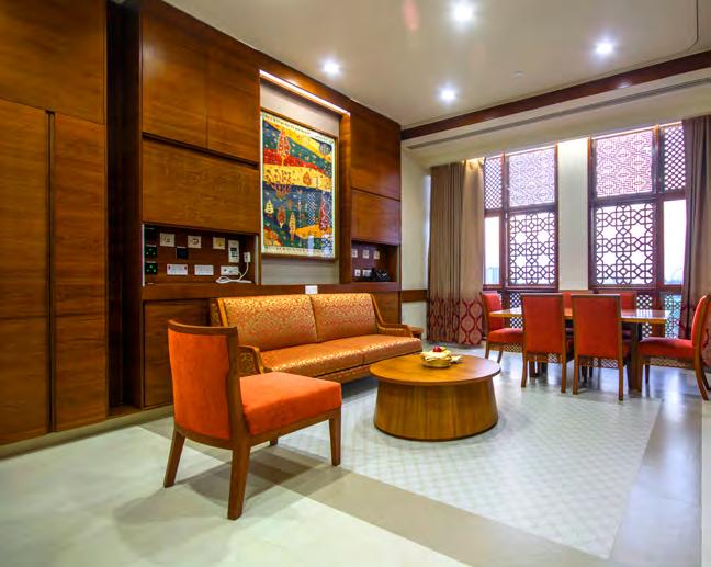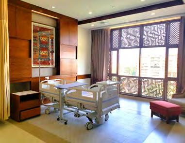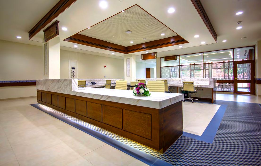 Die Behandlung der ziegelroten Außenfassaden erfolgte nach dem „Tränenputz“-Verfahren, einer Verarbeitungstechnik, mit der die Wärmestauung reduziert werden soll. Dies wird durch die Materialeigenschaften der Oberfläche erreicht, die Schatten auf der Außenwand erzeugt, wodurch das Innere kühl bleibt und gleichzeitig das Gebäude vor Wasser geschützt wird. Bei der Gestaltung der Innenräume, von den Gemeinschaftsbereichen über die Wartezonen und Flure bis hin zu den Patientenzimmern, wurde großer Wert auf die Verwendung von Materialien gelegt, die eine hohe Umweltqualität gewährleisten und die traditionellen Fertigungstechniken des Landes gekonnt mit modernem Design verbinden. So erinnern beispielsweise die großen, von Hand gearbeiteten Messingleuchten in der großen Halle an die traditionelle Handwerkskunst des Landes; vor allem aber wird die Geschichte des pakistanischen Teppichs in den Bodenbelägen aus Feinsteinzeug in einer gelungenen Neuinterpretation gewürdigt.