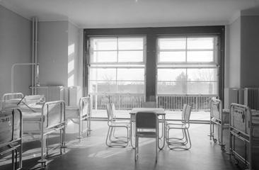 2. Hôpital de la ville de Vienne, pavillon de la tuberculose : chambre de repos avec vue sur la terrasse, 1930. Krankenhaus der Stadt Wien, TuberkulosePavillon: Patientenzimmer mit Blick auf die Terrasse, 1930. Wien (AT)