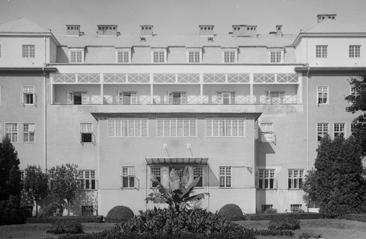 1. Sanatorium Purkersdorf, Joseph Hoffmann (1904-1905). Vue de la façade agrandie par Leopold Berger, 1926. Sanatorium Purkersdorf, Joseph Hoffmann (1904-1905). Fassadenansicht der Erweiterung von Leopold Berger, 1926. Purkersdorf (AT)